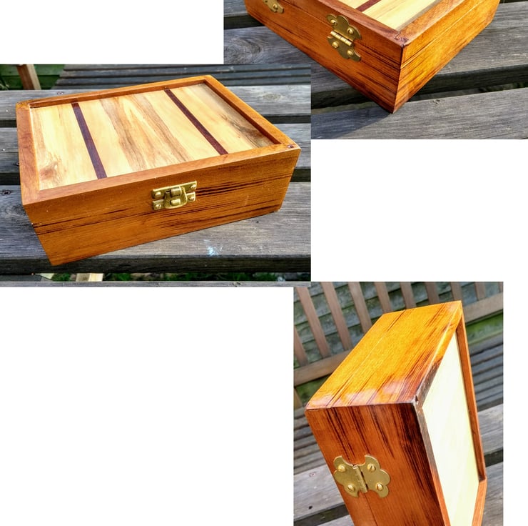 I chopped a cherry tree down about ten years ago, for my father in law and he let me have the wood, some of which spalted ( a lovely pattern in the wood that is highly desired) whilst being seasoned in my garden. I re-sawed the cherry and stuck a coupe of strips of ebony (that were left over from a guitar I'd made) to make the box lid. the base is marine Plywood and it has all been finished with melamine laquer. It has some little, faults three dimples on the corner joints and some saw marks between the hinges, but I don't know if I should spend another day re finishing it.... so it is being offered as it is.... hope you like it
