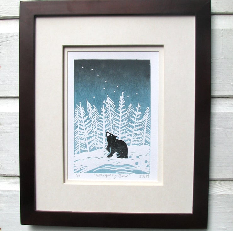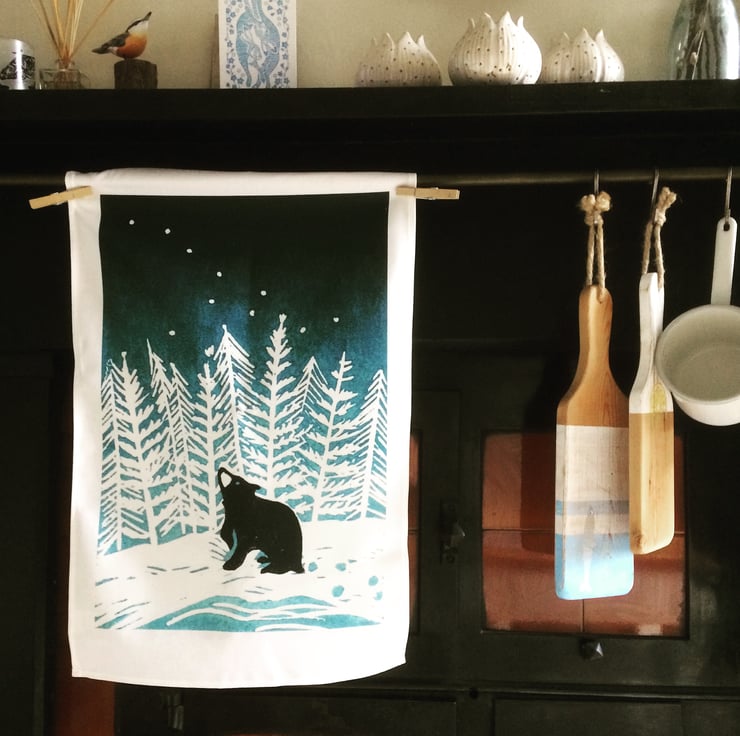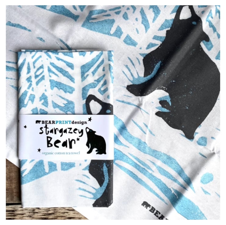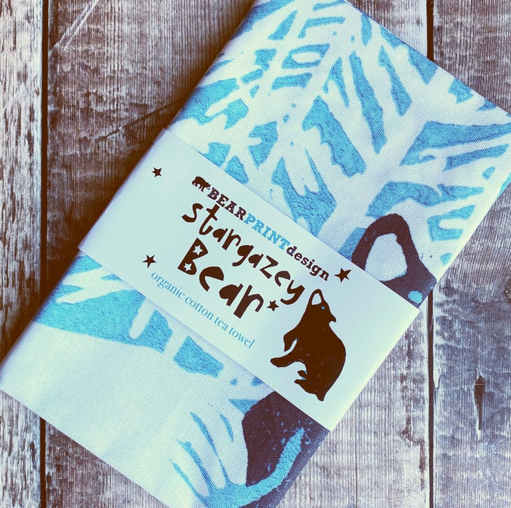 Stargazey Bear is my most popular Lino print to date, so it's only right that he should be able to grace your kitchen as well as your wall! This is a lovely quality 100% organic white cotton tea towel measuring a generous 48cm x 78cm with a hanging loop. It comes folded with a printed belly wrap and will be sent in first class post. If you love him too much to give him away, why not buy two? (Design also available as a print.)