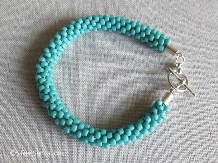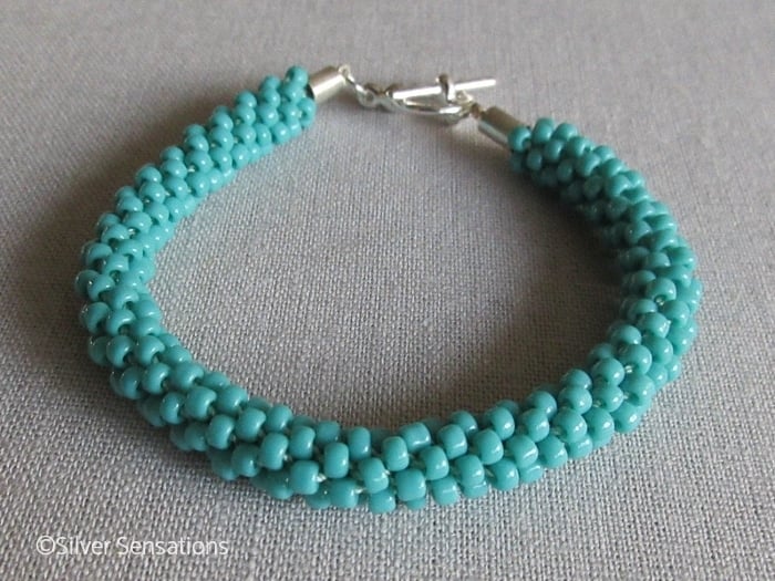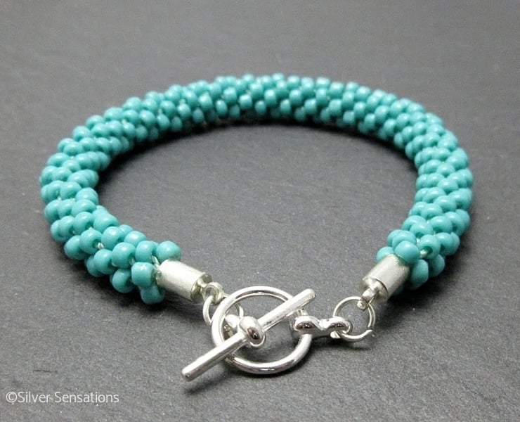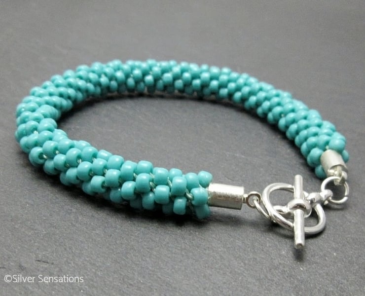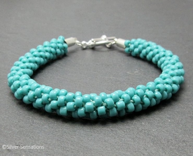 An easy to wear greenish blue turquoise Kumihimo fashion bracelet with high quality 3mm Matsuno seed beads.