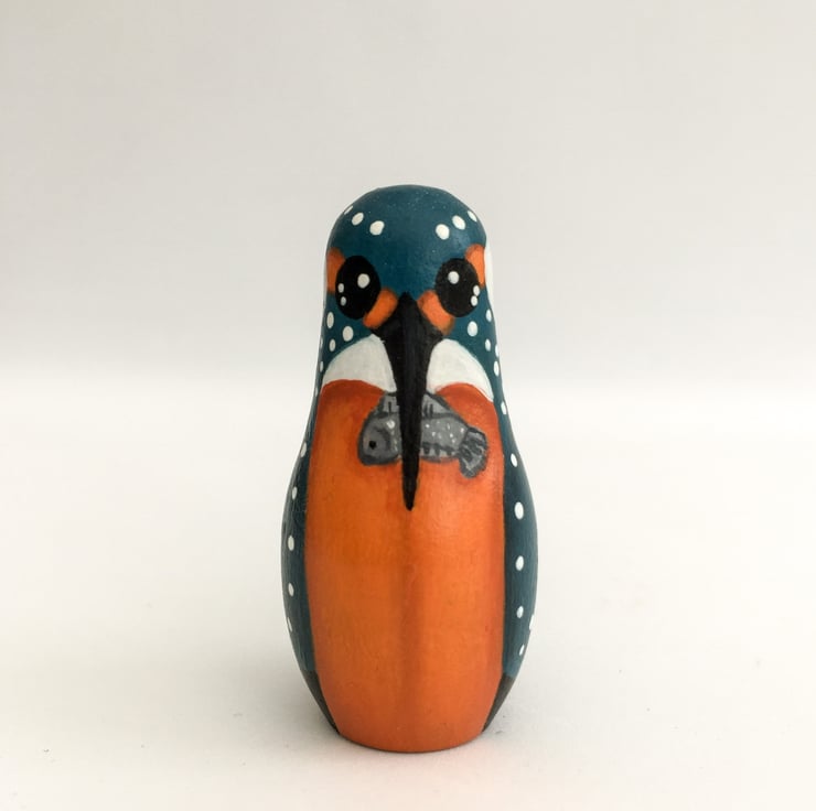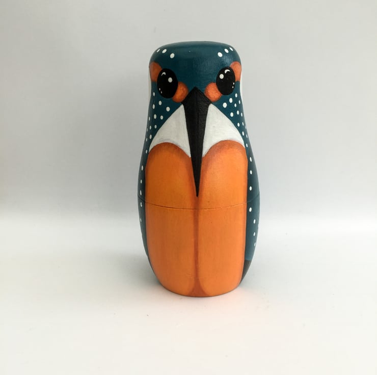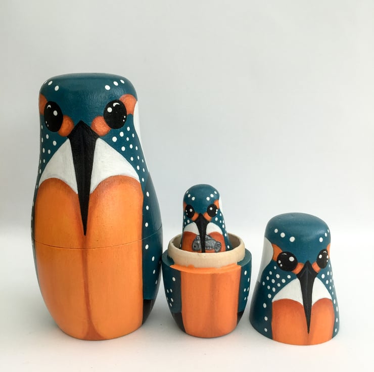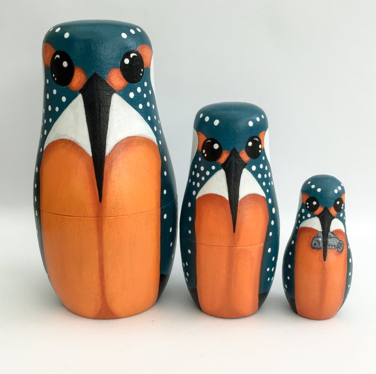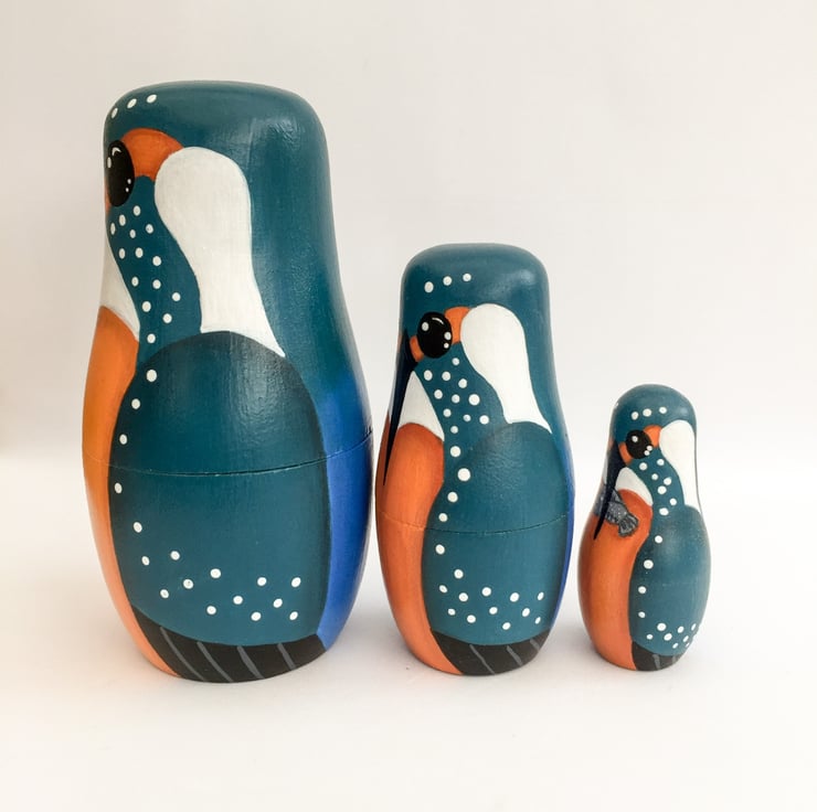 These colourful kingfishers make up a set of 3 wooden nesting dolls.