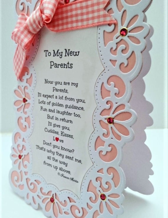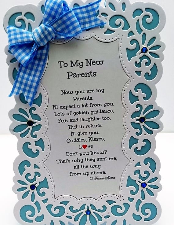 I thought it would be a novel idea to write the verse from the baby to the New Parents. I wrote it many years ago and made a similar card for a friend who was so delighted with it she encouraged me to make it available for others to buy. Hope you like it too.