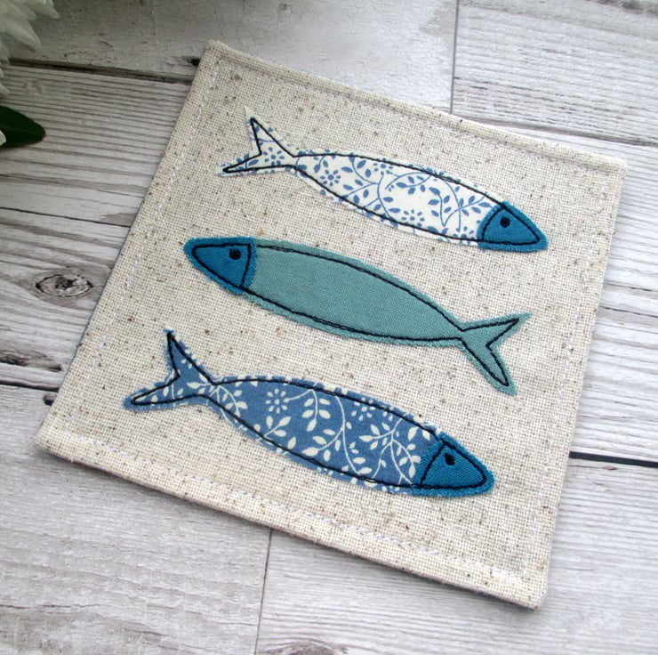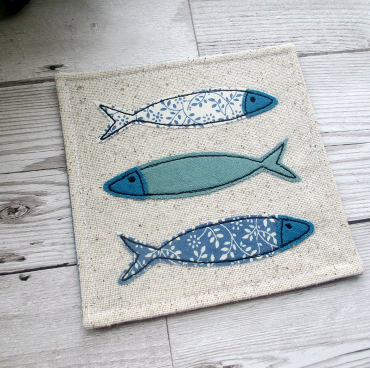 The coaster has 3 fish appliqued in 100% cotton fabric using free motion machine embroidery which allows me to draw freehand with the needle and thread on my sewing machine.