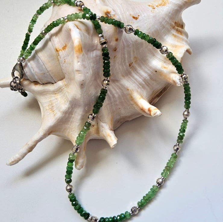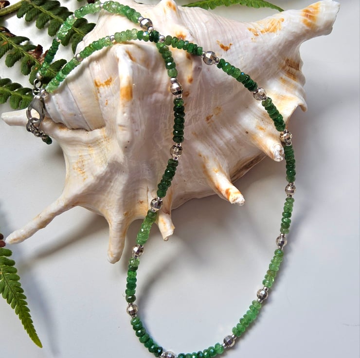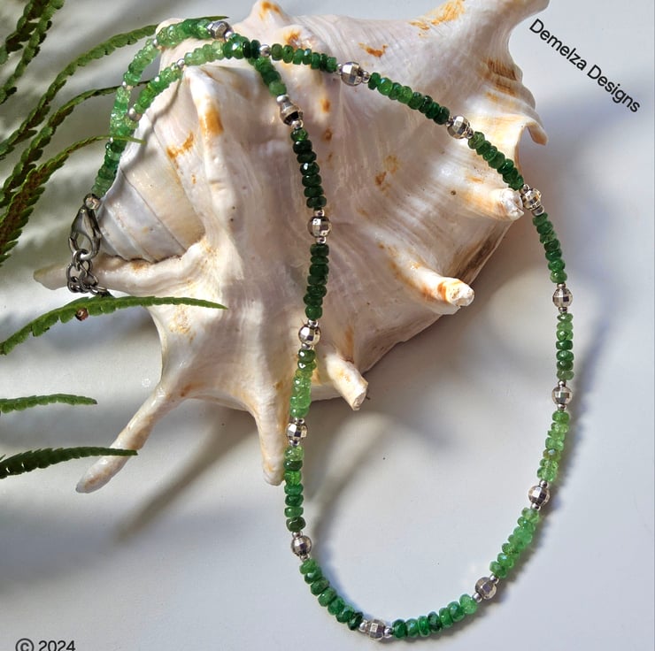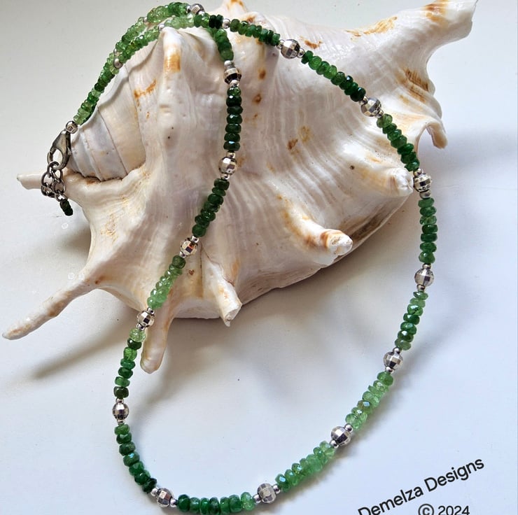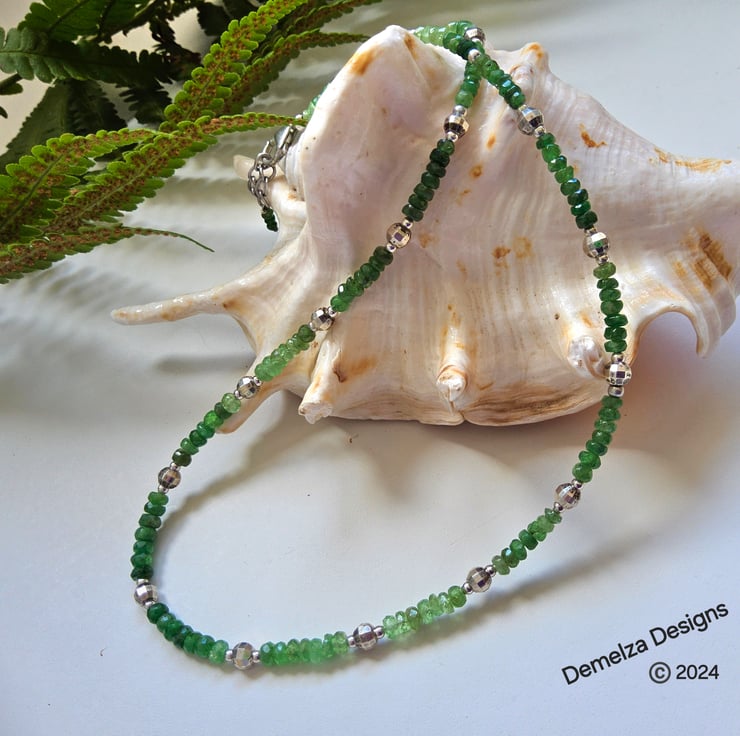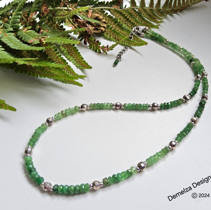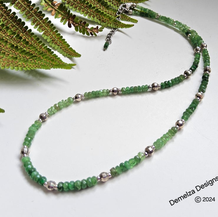 Within the design I have incorporated faceted 925 sterling silver spacer beads with smaller 925 sterling silver spacer beads to compliment the emeralds. The necklace has a 925 sterling silver extender chain with a quality 925 sterling silver clasp.