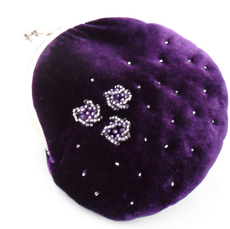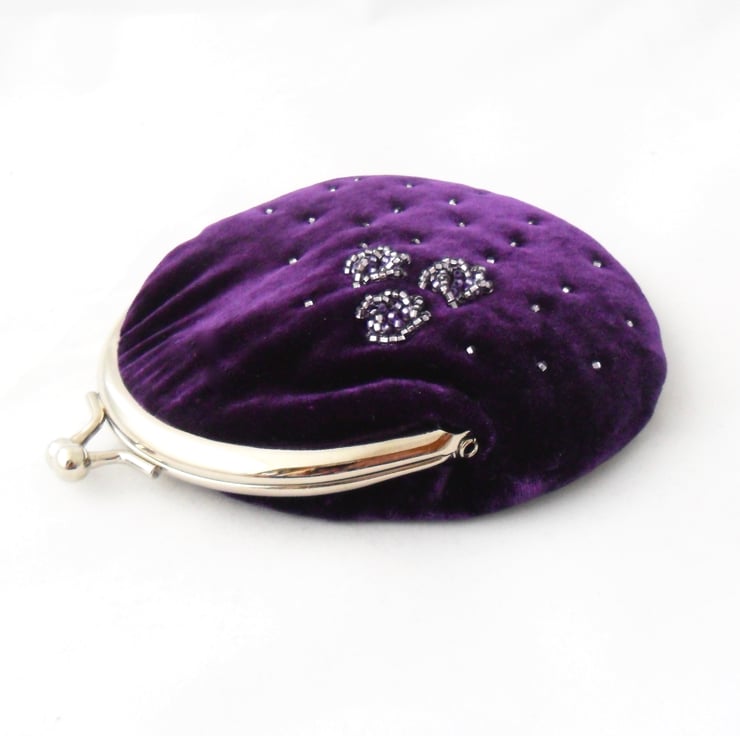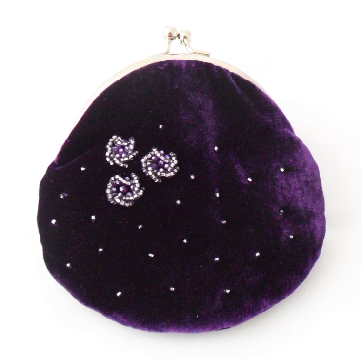 Both practical and pretty, this coin purse, is in a beautifully soft purple viscose/silk velvet, and has been decorated with bead embroidery. The purse lining is a purple duchess satin and it's set into a 4" (10 cm) silver colour frame. The perfect size for carrying your keys and cash on a night out or other special occasion.
