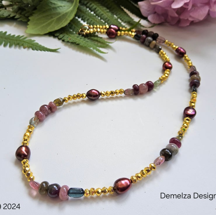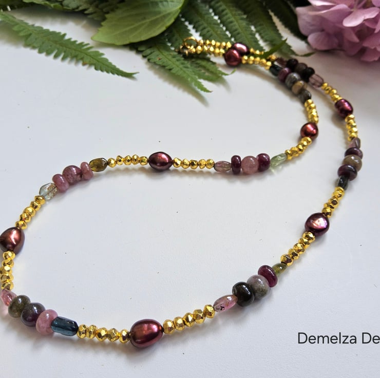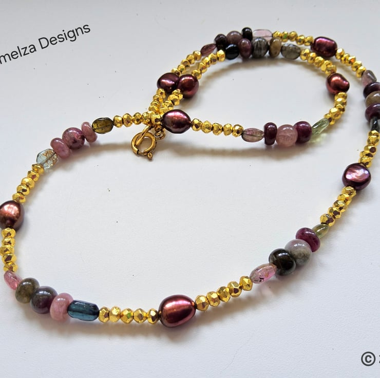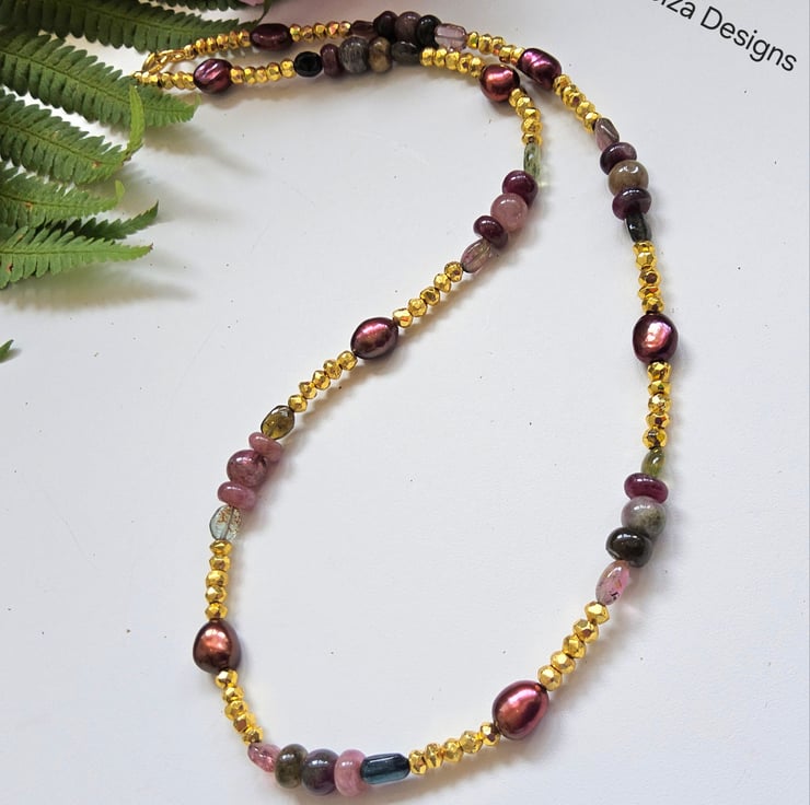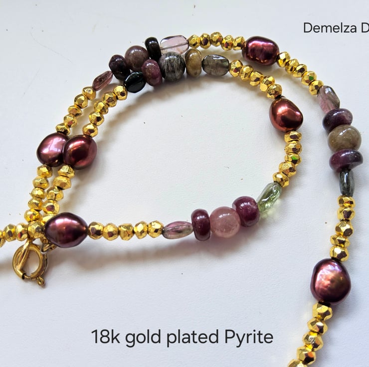 A very unique eye catching necklace hand crafted in Cornwall and designed by myself using genuine 18k gold plated pyrite gemstone free faceted rondelles, freshwater culture pearls and tourmaline round gemstones. The necklace has been constructed using professional stainless steel jeweller's wire for added strength and long durability, complimented with gold vermeil findings.