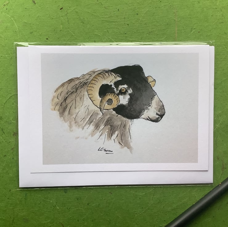 Card featuring a print of my farm animal drawings - the blackface sheep. Blank inside for your own greeting or note.