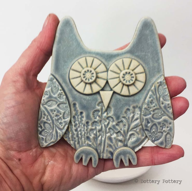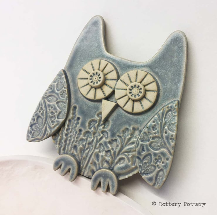 This cute ceramic owl is made from textured stoneware clay with all the individual pieces hand cut and decorated with pattern.