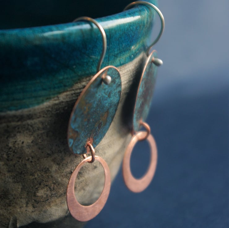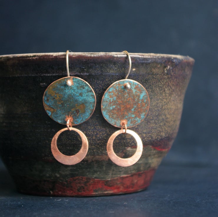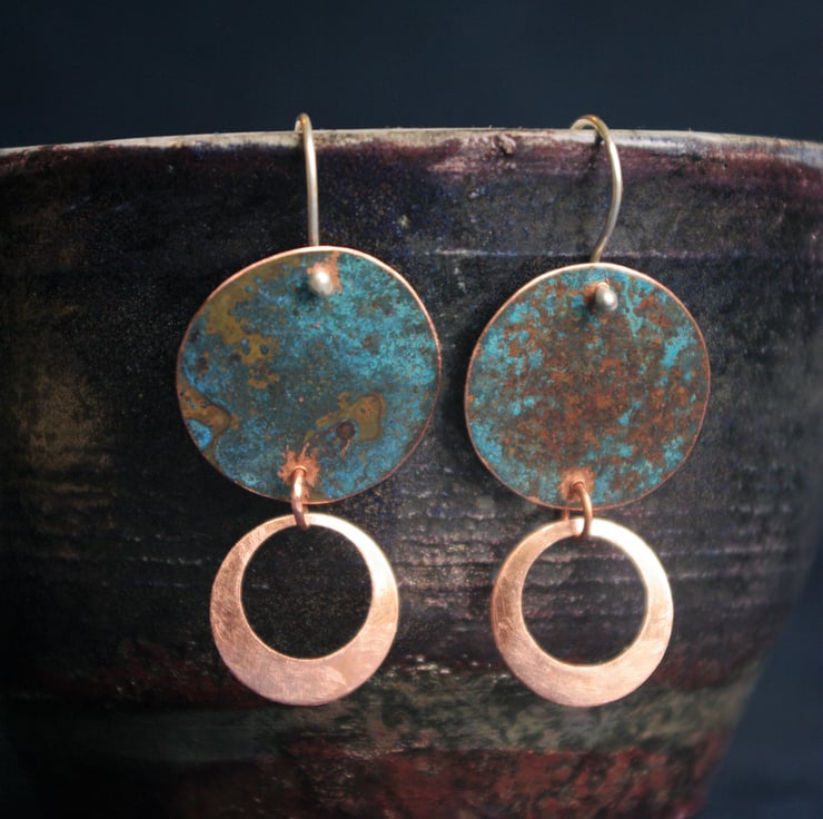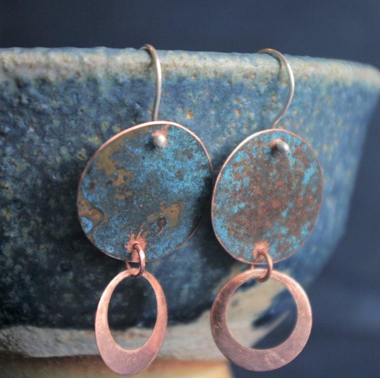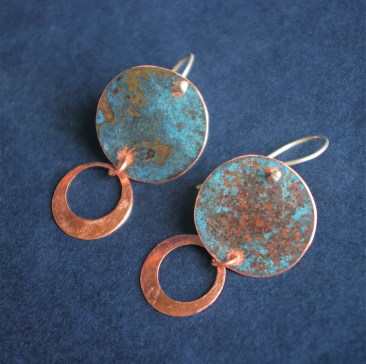 I have used patination techniques to create a blue-green , textured finish on copper discs of 22mm in diameter/ nearly an inch.
