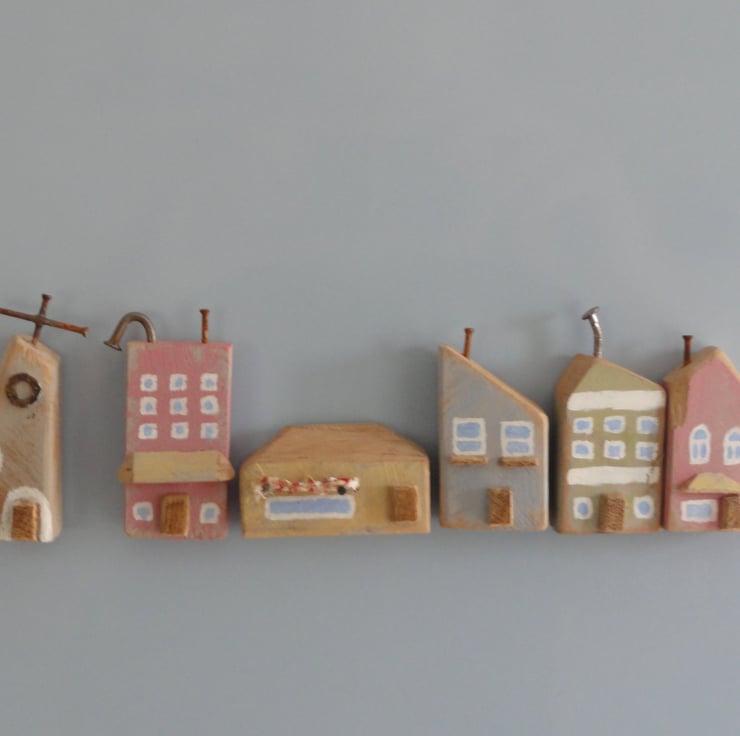 One of a range of little buildings made from solid oak, this one is hand painted with a grey chalk undercoat and topped with pastel blue then sanded to reveal parts of each and the natural wood.