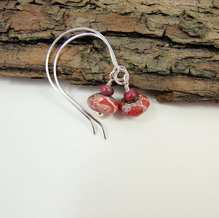 Hand crafted open hoop ear fittings paired with long small red jasper and natural ruby gemstone rondelle beads.