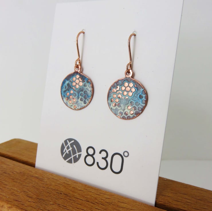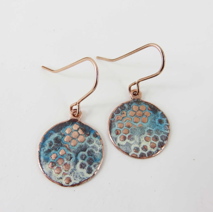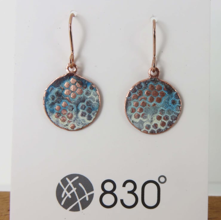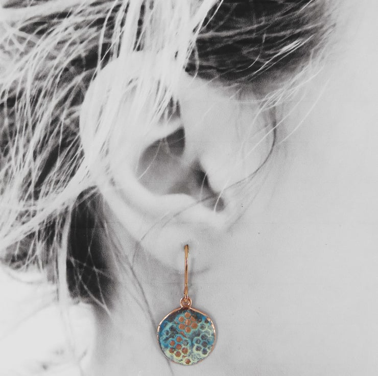 15mm circle copper dangle earrings decorated with a lacy texture and washed with an ivory and blue enamel. Some raised areas are sanded back to reveal the copper beneath. Hung on rose gold plated earring hooks for pierced ears. Fired in the kiln at 830 degrees.