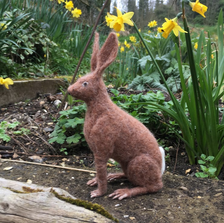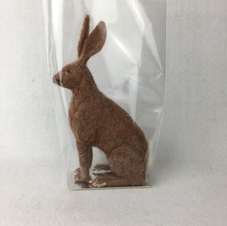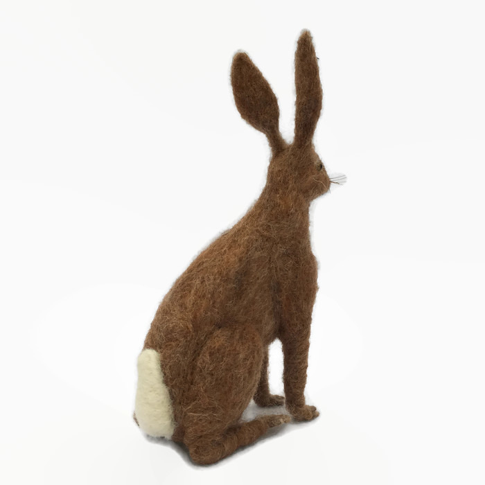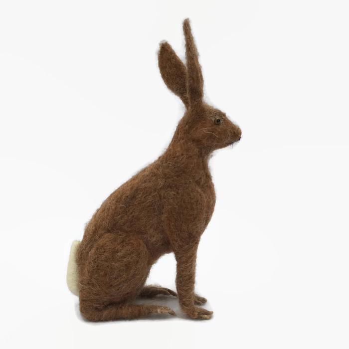 This fabulous needle felted brown hare has been made using woollen fibres and a barbed felting needle. Continuous stabbing at the woollen fibres with the felting needle allow the model to be shaped as desired. He has acrylic eyes and horse hair whiskers.