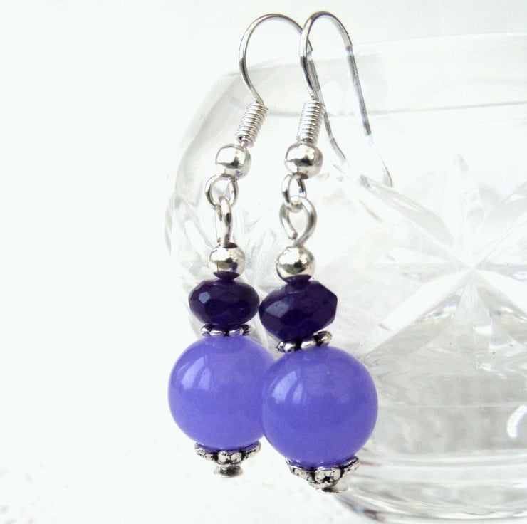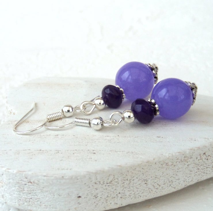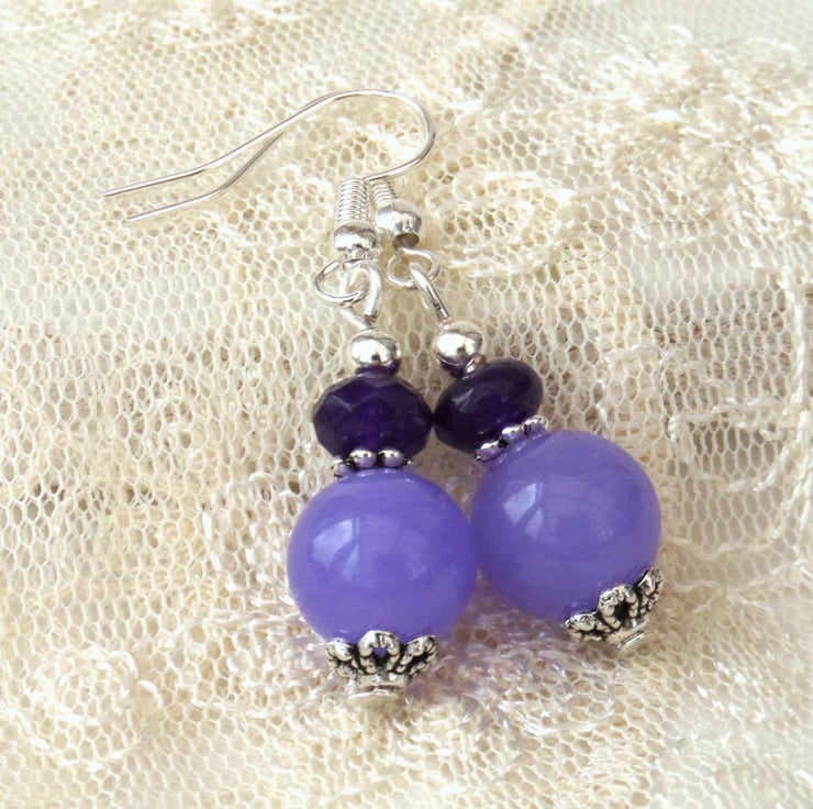 A lighter shade of purple jade is combined with a smaller deeper purple jade rondelle bead to make these pretty earrings.