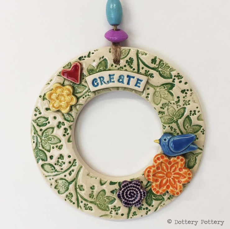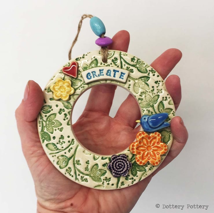 This bird themed hanging wreath decoration has been made from white earthenware clay and fired twice.