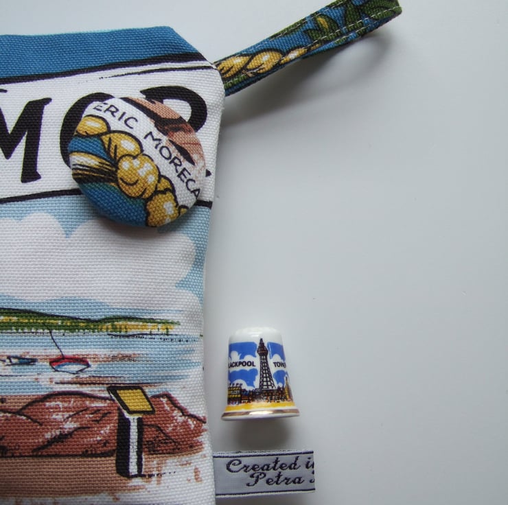 This soft little vintage tea towel bag, has a picture of Morecambe bay on one side and Sunderland point on the other. It’s a typical seaside illustration, bright, breezy, and fun.