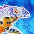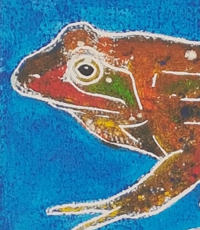 Speckled frog depicts a Common Frog. It is an original hand painted monoprint from a lino block and printed on a hand press. The background is in a vivid blue and the frog is multi-coloured in orange and yellow with dark stripes on its legs.