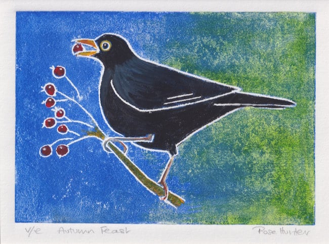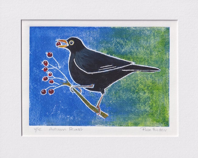Autumn feast depicts a blackbird enjoying natures bounty of berries. It is a hand painted lino print from a lino block and printed on a hand press. The background is blue and green with the bird in black and berries in red.