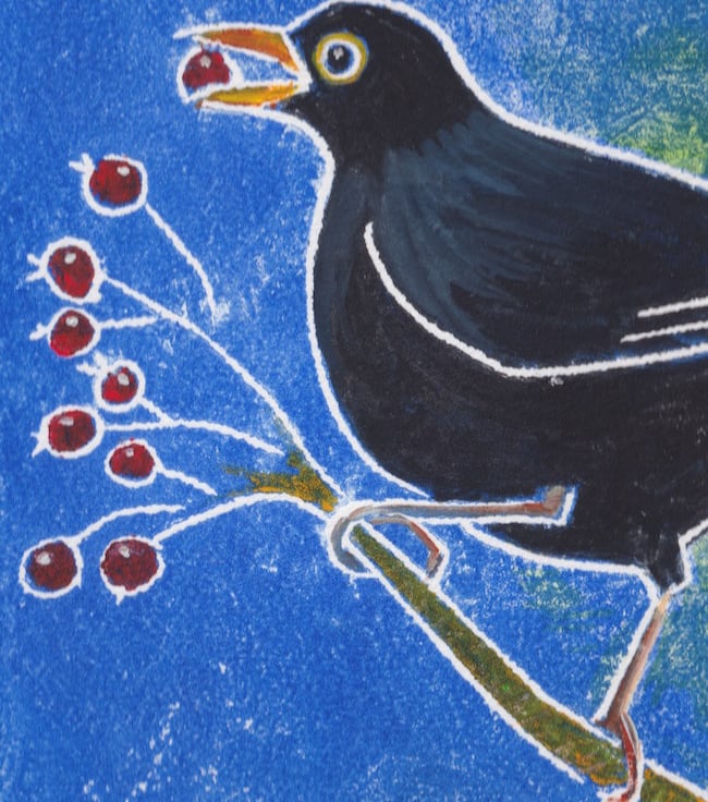 Blackbirds are charming birds, with a lovely song and a distinctive alarm cry to warn other birds of a feline danger or an over enthusiastic gardener. I love watching them in the garden in autumn and early winter feeding on berries and have tried to capture their grace and confidence in this lino cut.