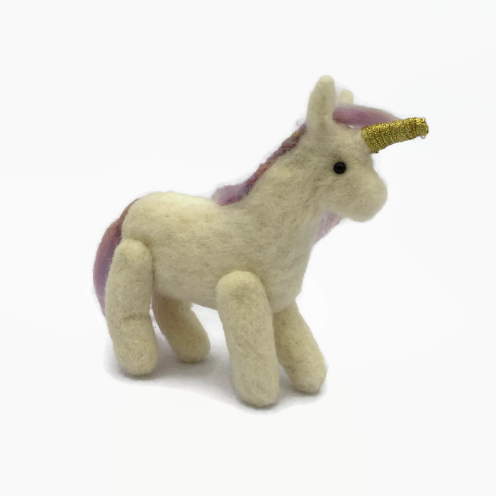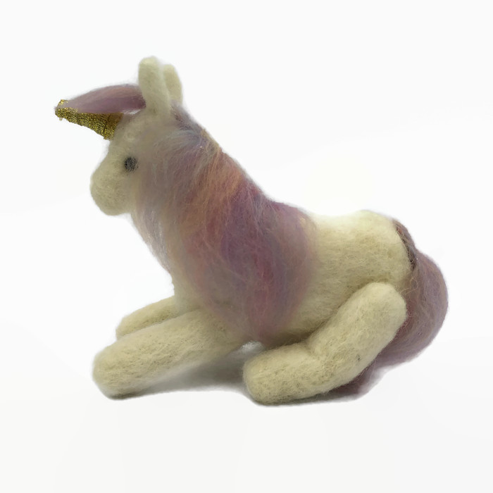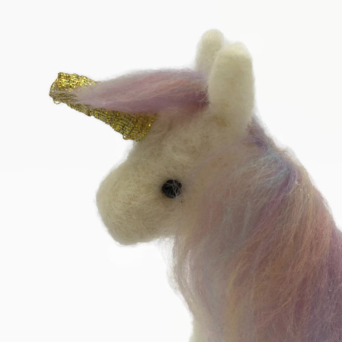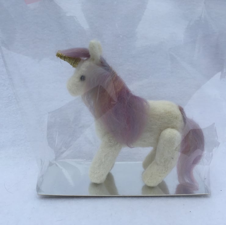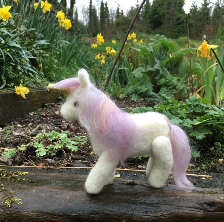 A gorgeously cute little unicorn needle felted using 100% wool. A beautiful mane and tail have been needle felted on using combed woollen fibres in pretty pastel "unicorn" colours and his horn has been covered in gold coloured ribbon. The unicorn has moveable legs allowing him to be positioned in a standing, sitting or lying position. Black acrylic half pearls have been added as eyes.