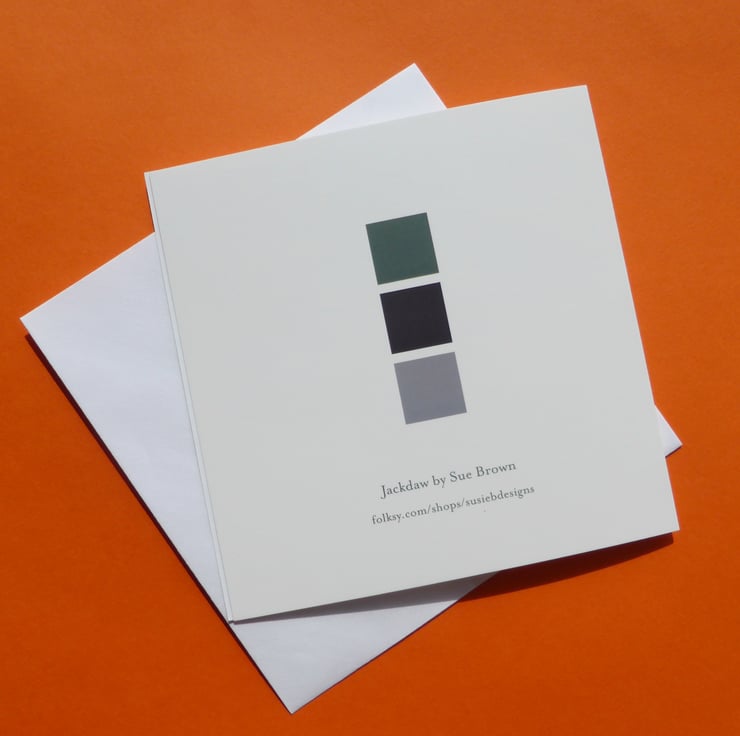 I've tried to capture the sheen of their black feathers in greens, purples and indigo. The original painting was done on a softly textured watercolour paper, and the image on the card shows that texture against an off-white background. On the back of the card, I chose three colours from the painting to feature.