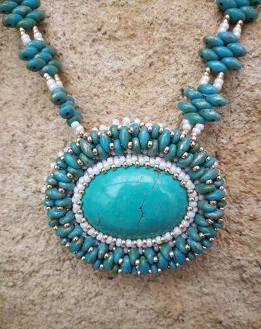 Handmade bead woven Gemstone Necklace with stunning Turquoise Howlite centre piece. The Necklace has been handmade and hand stitched using specialist beading thread and a fine needle. A Native American stitch called peyote has been edged around the Turquoise Howlite cabochon securing it into place.