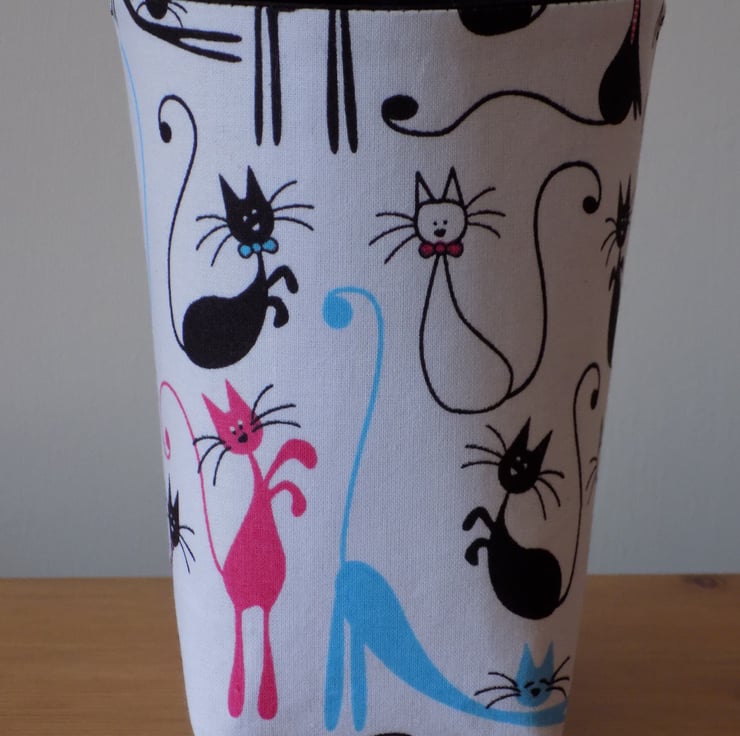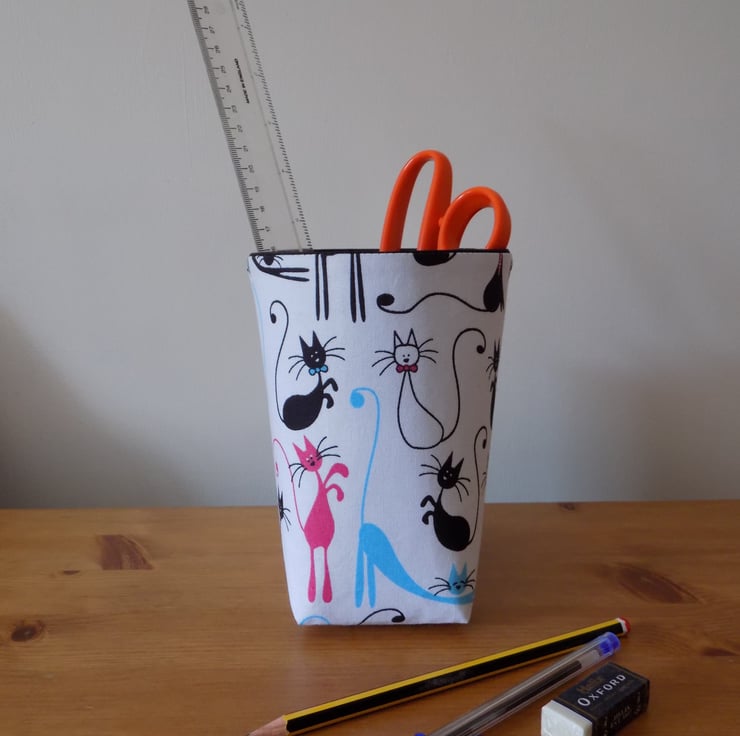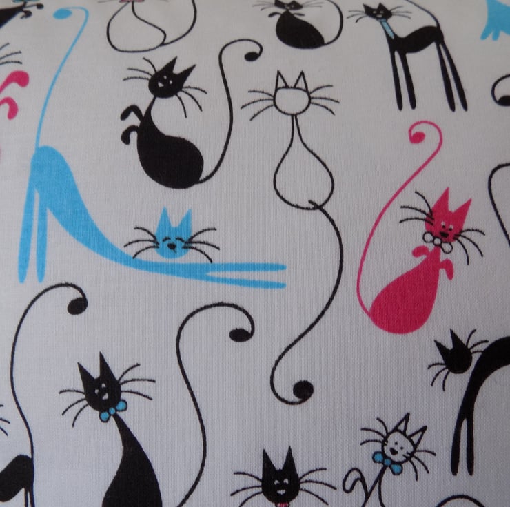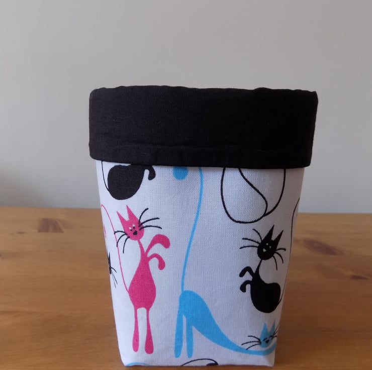 This convenient and versatile storage basket is made from a delightful new high quality cotton fabric, featuring playful pink, turquoise, black and white skinny cats on a white background.