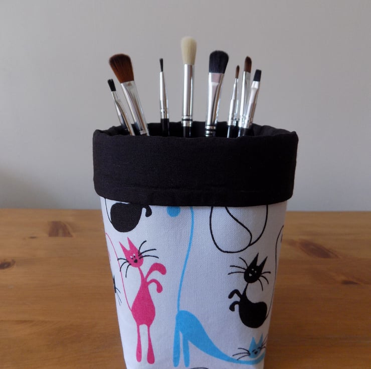 This fabric storage basket makes an ideal self-standing storage container for either cosmetic or stationery items and can be used in a fully upright position, or rolled down at the top to reveal a co-ordinating black lining.