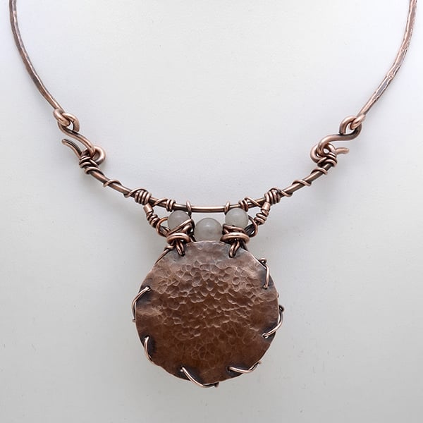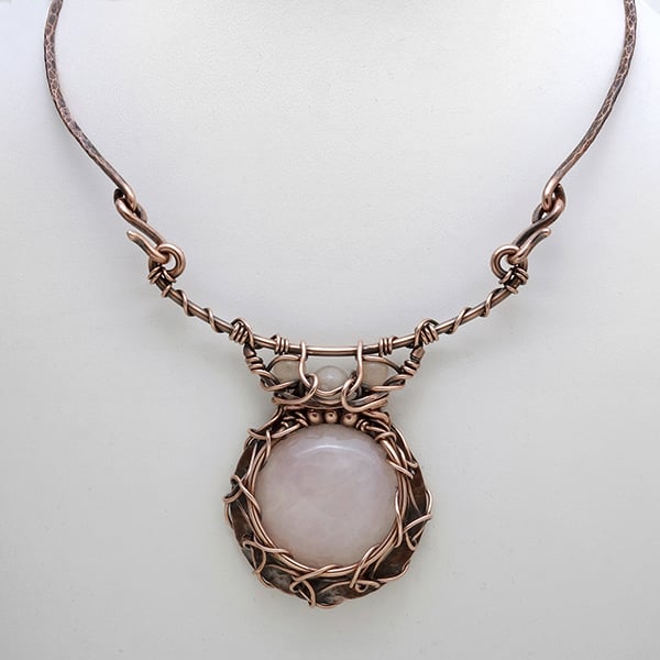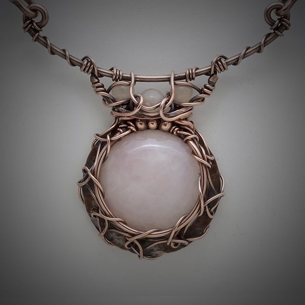 This jewellery has been created using weaving, layering and dimensional shaping techniques to achieve an interesting, energetic form that flows. A unique rose quartz stone is held securely in copper sheet and wire, intricately wrapped and manipulated to be structurally sound and complimentary to the shape and character of the stone. This piece also has a hammered texture and has been oxidised to give an antique appearance.