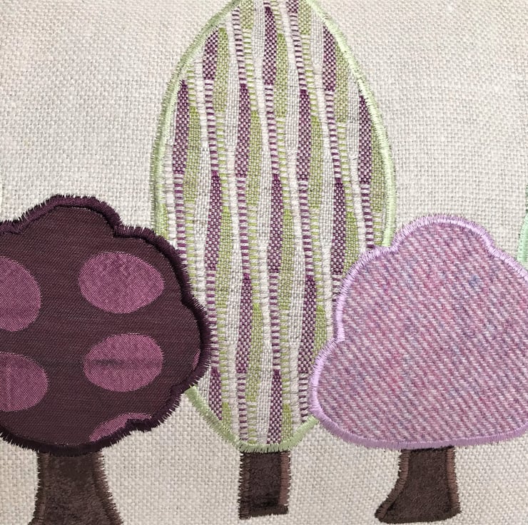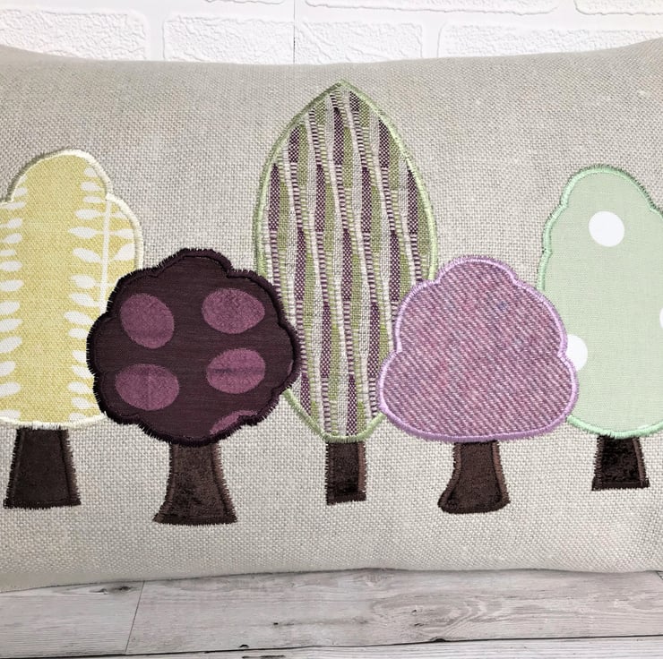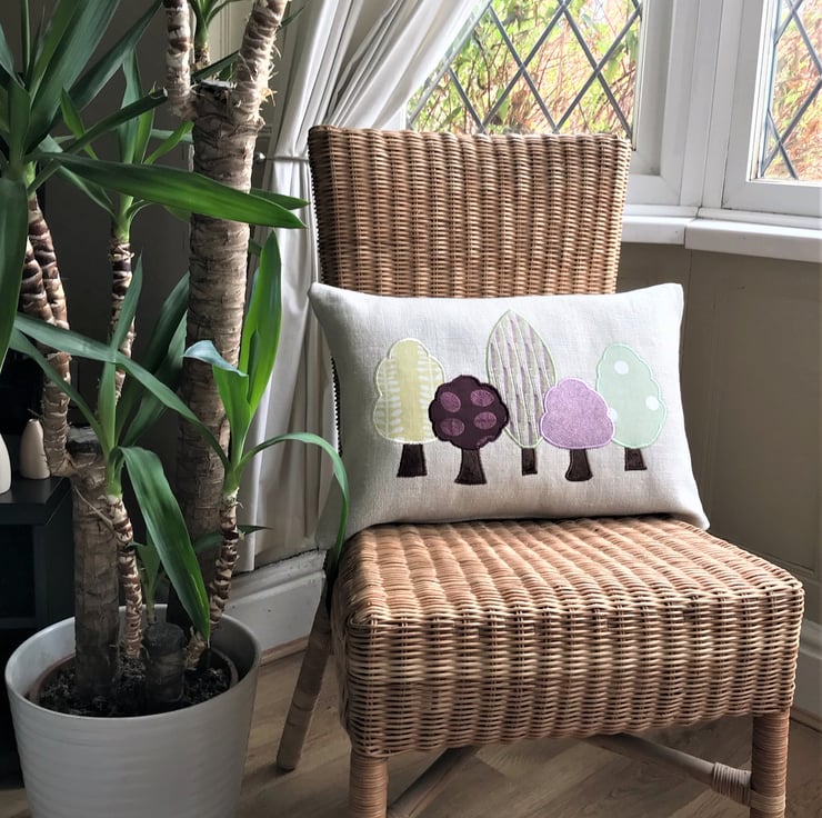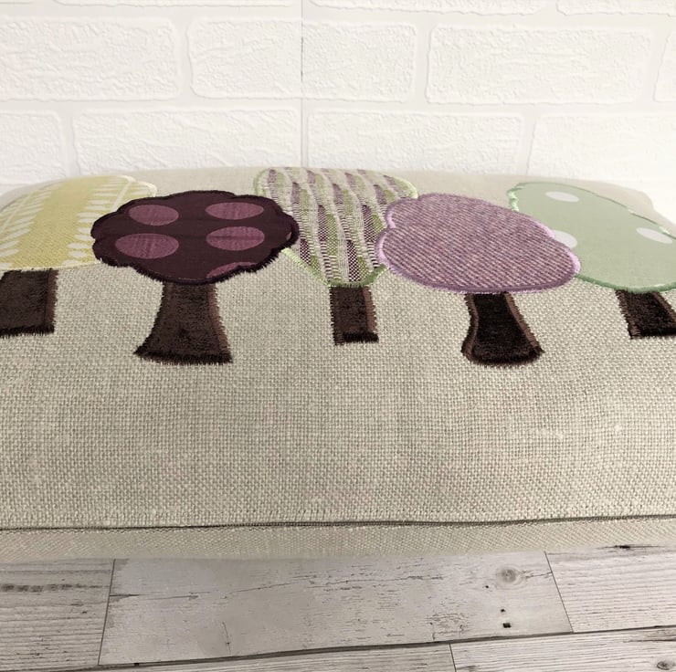 A Spring trees cushion, rectangular in shape. The cushion is made from a rustic woven cream fabric with a woodland applique design of five trees in Spring colours. The trees consist of a variety of fabrics with wonderful woven, print and textured patterns in fresh Spring shades of green, yellow-green, purple and lilac. The trunks are made from a lovely rich brown velvet-finish fabric.