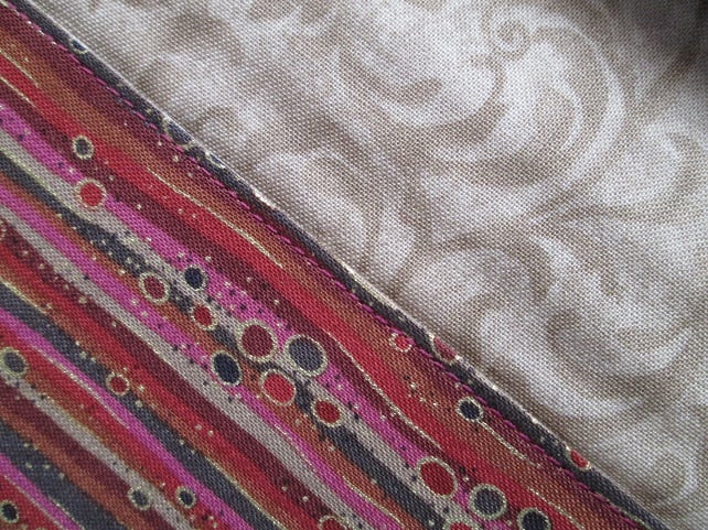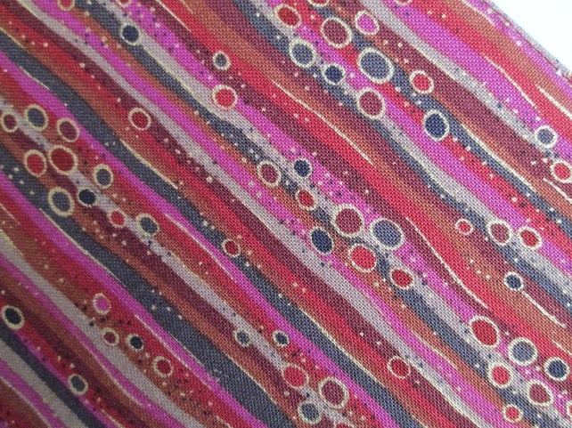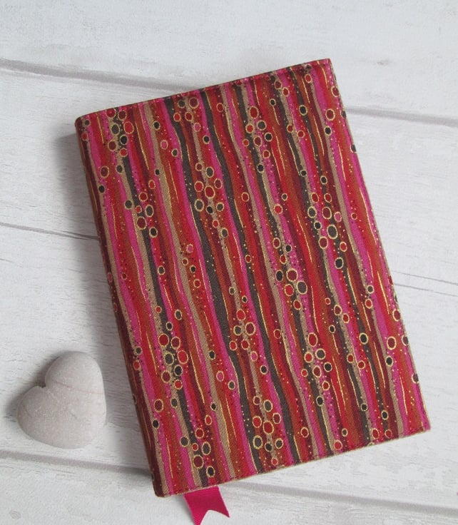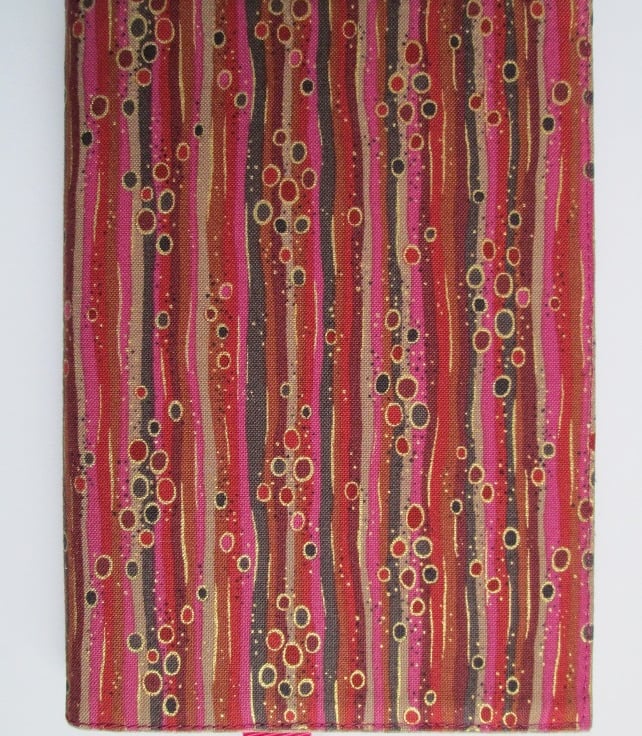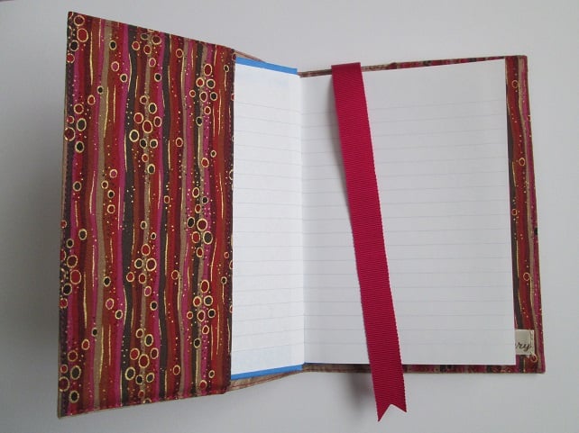 The item title for this doesn't do it justice - its a ripply stripe of red, pink, coffee and brown, overlaid with spots of the same colours and highlighted with metallic gold. There was just one remnant in the shop and it was just big enough to make this very smart notebook cover. I've lined it with a coffee coloured scroll print and added a ribbon place marker. A6 notebook included.