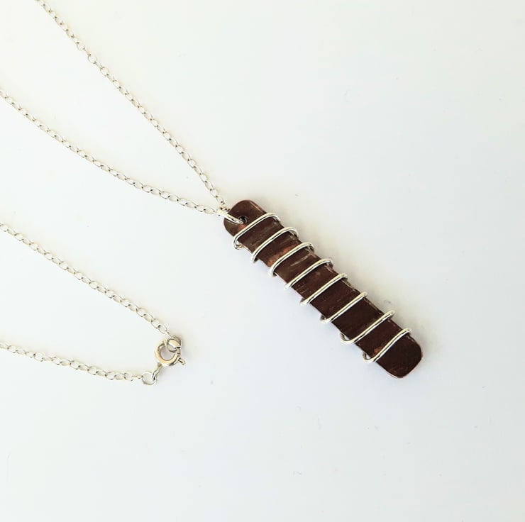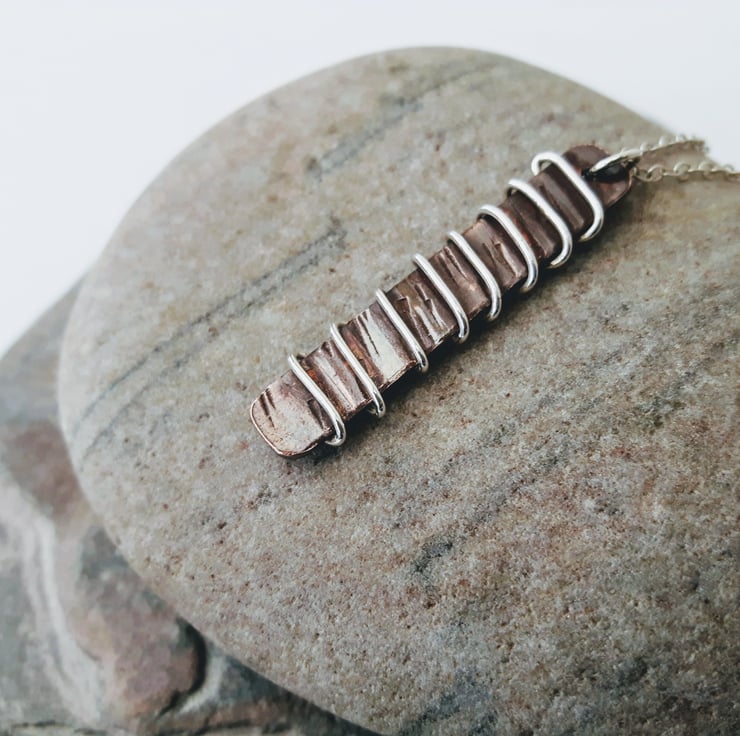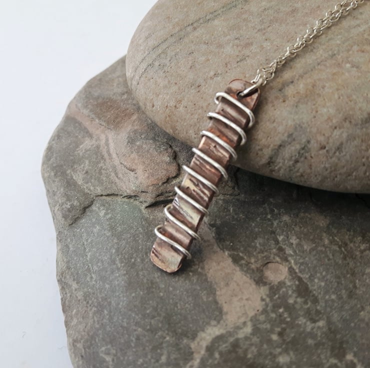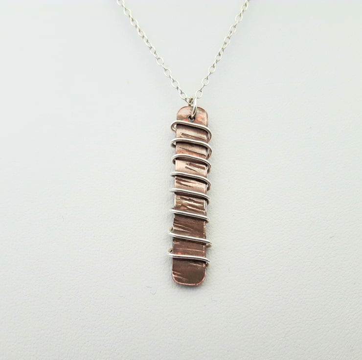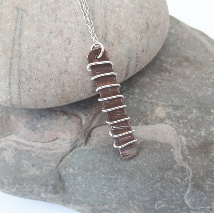 A rectangular pendant, cut from copper sheet and hammer-textured, drilled then wrapped with sterling silver wire. It is attached by means of a jump ring to a sterling silver trace chain. The copper has been oxidised to an antique bronze shade and finished with Renaissance wax to preserve the patina. This pendant will be packaged in a smart gift box and sent to you by Royal Mail first class post.
