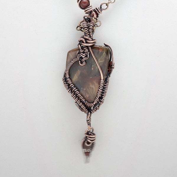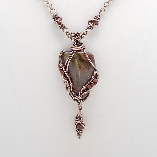 An unusual asymmetric Fine Jasper Necklace with Red Jasper accent beads around the focal stone, dangle and chain.