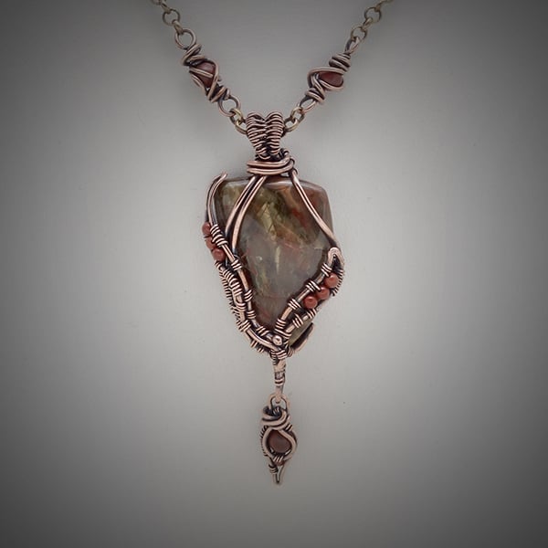 This jewellery has been created using weaving, layering and dimensional shaping techniques to achieve an interesting, energetic form that flows. A unique and rare natural Fine Jasper stone is held securely in copper wire, intricately wrapped and manipulated to be structurally sound and complimentary to the shape and character of the stone.