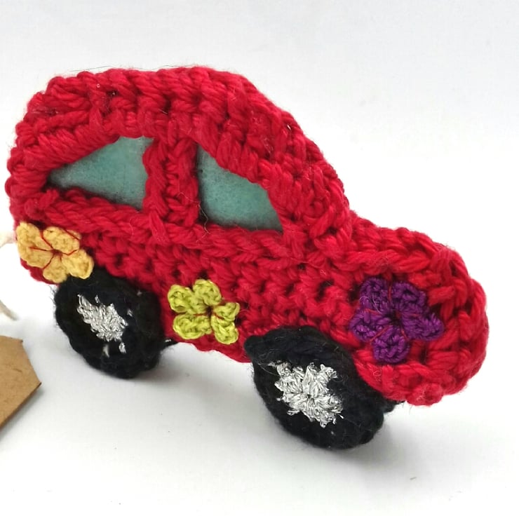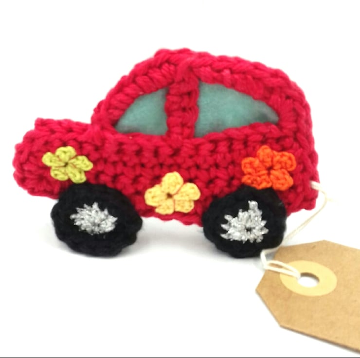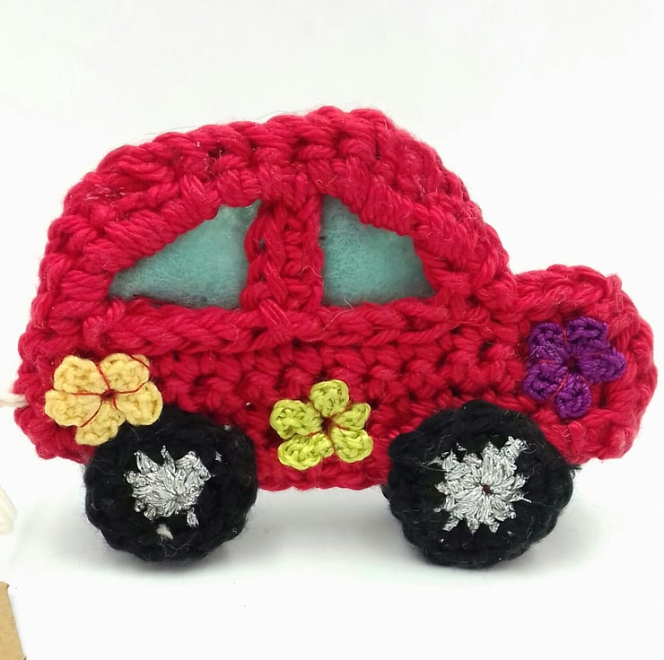 This little car would make a lovely keepsake alternative to a greetings card. It is crocheted in cotton and a silver metallic thread. The window frames are lined with felt and the body of the car is decorated with tiny crochet flowers. Although the car is essentially a 2D design, the four wheels allow it to be free -standing. The car measures approximately 8 cm by 5.5 cm and the tag reads 'Flower Power! " on one side and is blank on the other for your own greeting. Please note that I am very happy to exchange this tag for one with a message of your choice.