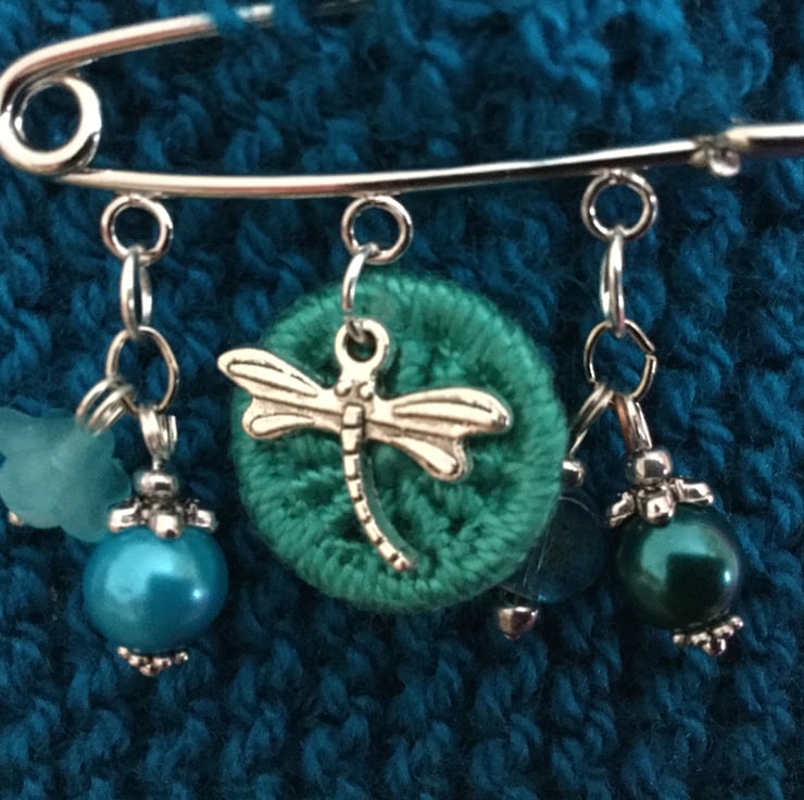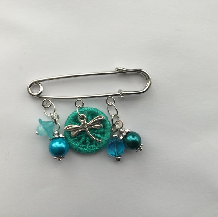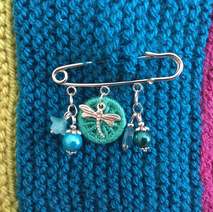 The Dorset button has been fastened to the centre hole together with a pretty white metal dragonfly charm. The other holes have two bead charms in each in varying shades of turquoise.