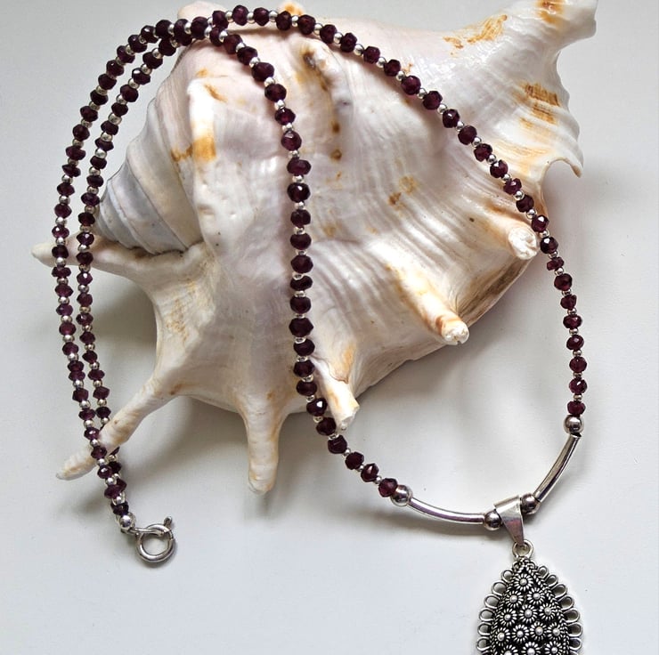 A beautiful necklace hand created and designed in Cornwall using genuine rhodolite faceted garnet gemstones which craduate in size from the front to the back. Rhodolite garnet is now becoming very rare to obtain. Rhodolite garnet is not as dark as Indian red garnet, but it has a more deep pink/ purple hue and feminine against the skin when any light source hits the gemstones. I have incorporated a oxidized sterling silver pendant within the construction of the necklace with sterling silver tubes, finished off with a sterling silver bolt ring clasp. To add even more luxery and sparkle between each rhodolite garnet are 2mm sterling silver spacer beads. The necklace has been constructed using professional stainless steel jewellers wire for added strength and durability for daily wear.