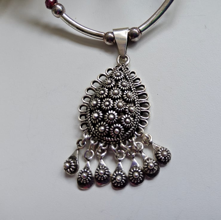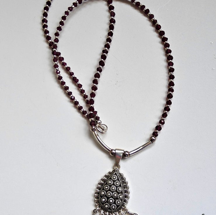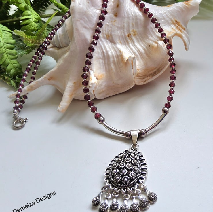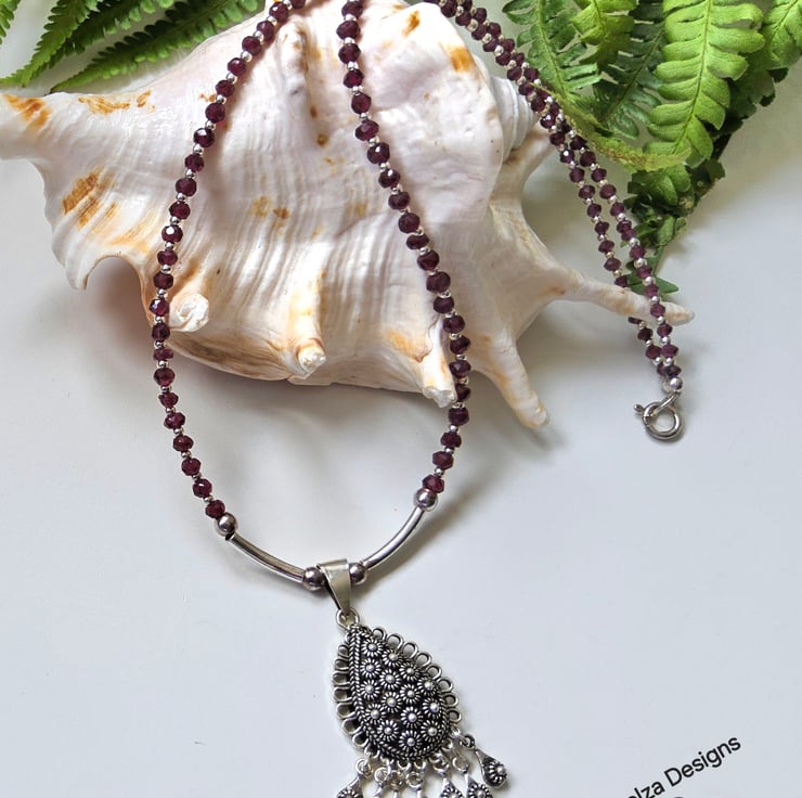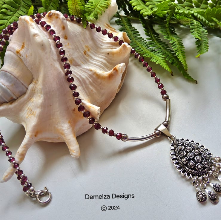 A beautiful necklace hand created and designed in Cornwall using genuine rhodolite faceted garnet gemstones which craduate in size from the front to the back. Rhodolite garnet is now becoming very rare to obtain. Rhodolite garnet is not as dark as Indian red garnet, but it has a more deep pink/ purple hue and feminine against the skin when any light source hits the gemstones. I have incorporated a oxidized sterling silver pendant within the construction of the necklace with sterling silver tubes, finished off with a sterling silver bolt ring clasp. To add even more luxery and sparkle between each rhodolite garnet are 2mm sterling silver spacer beads. The necklace has been constructed using professional stainless steel jewellers wire for added strength and durability for daily wear.