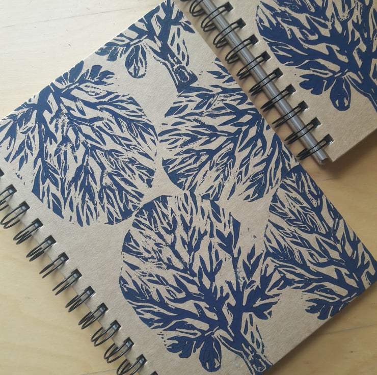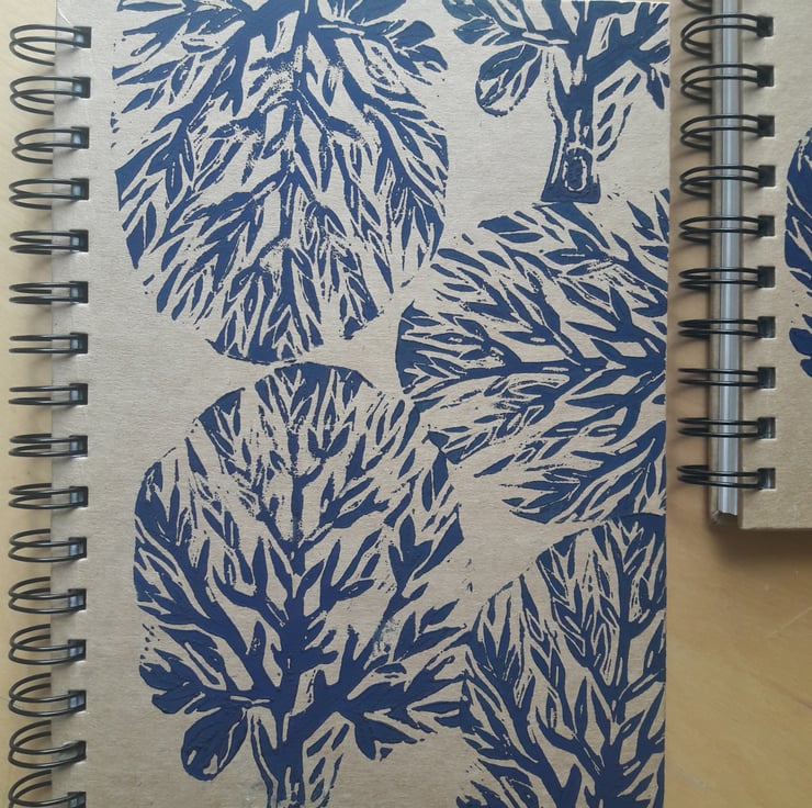 A5 spiral notebook, handprinted with a linocut pattern of tree motifs on a brown kraft cover.