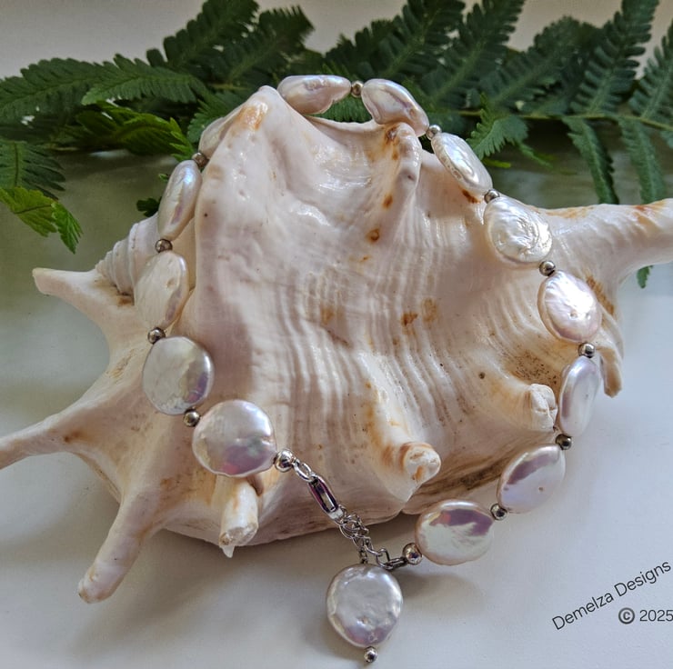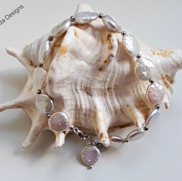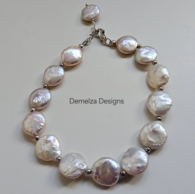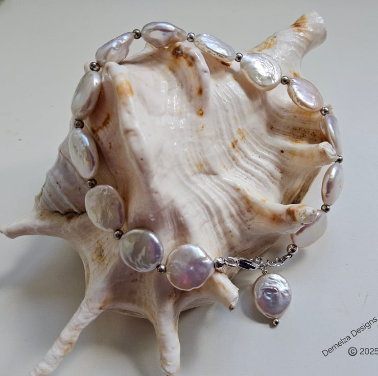 A beautiful quality baroque coin pearl bracelet ideal for any bride to wear on her wedding day and for all occasions for years to follow. This item will also appeal to ladies of all age groups whom value and desire total individual designer gemstone jewellery to wear on a daily bases.