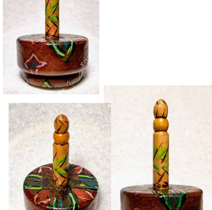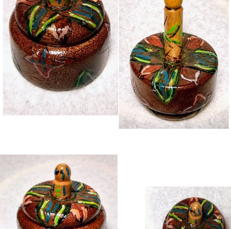 78mm tall with an 8mm diameter beech dowel at the centre, the body is40mm diameter and 26 mm tall with flower motifs engraved using phyrographic techniques after it was hand turned on the lathe, following which acrylic paint has been applied by brush and an acrylic varnish over the whole object, which weighs 26 grams.