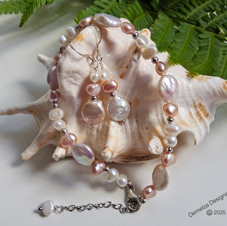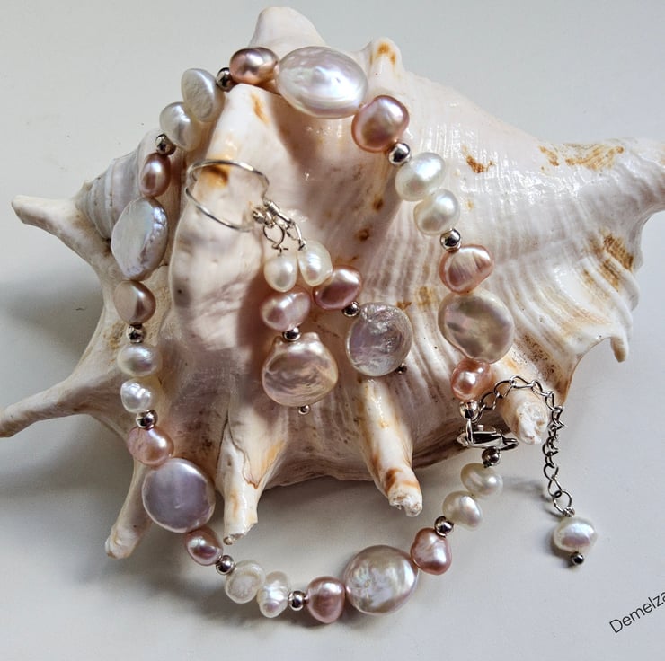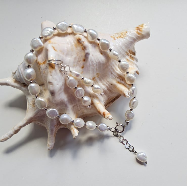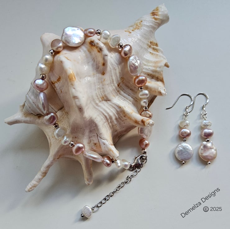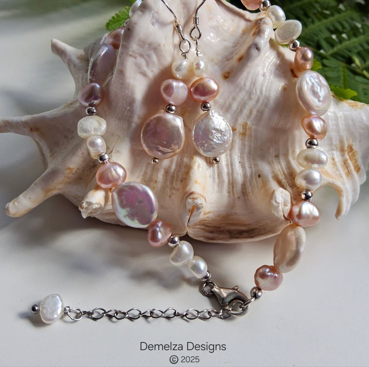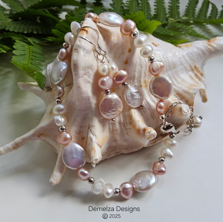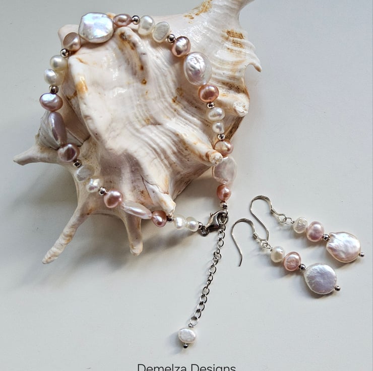 A very unique eye catching bracelet and earrings set any lady would be proud to wear on a daily basis. It has been designed and hand crafted using quality coin and baroque freshwater culture pearls complimented with a 925 sterling silver extender chain, spacer beads and clasp adding a touch of luxury and sparkle. The earrings match the bracelet pearls used.