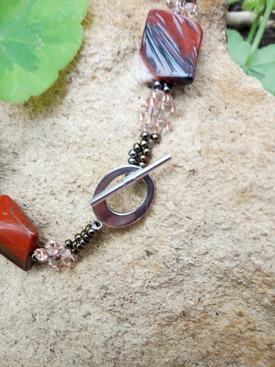 I love experimenting with different Jewellery Making techniques alongside gemstones and the great textured effect of the twin hole beads combined with the red jasper beads.