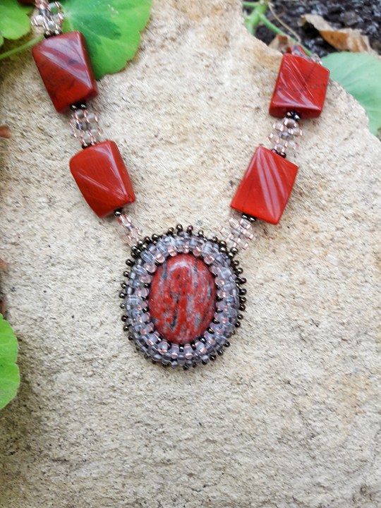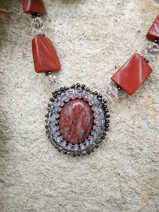 Handmade Gemstone Necklace with stunning oval Red Jasper centre piece. Hand stitched, using specialist beading thread and a fine needle. A delicate stitch called peyote has been edged around the Red jasper gemstone cabochon securing it into place.