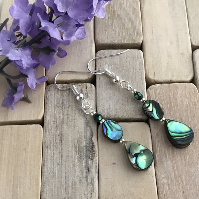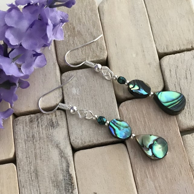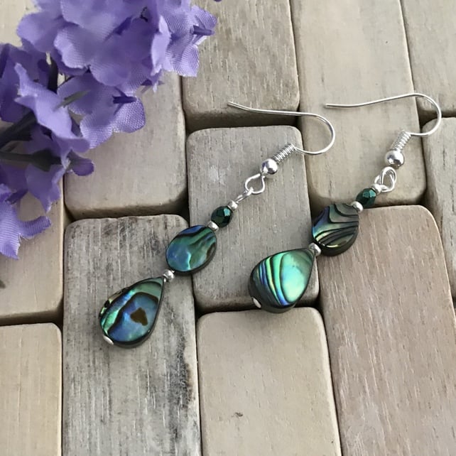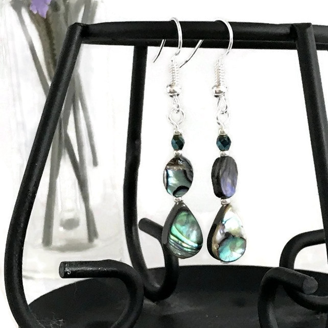 Each one features an abalone 11x7mm teardrop and 8x6mm oval that displays all the colours, swirls and iridescence that abalone gives.