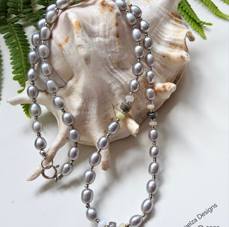 A beautiful sophisticated top quality freshwater rice pearl, labrodite and Ethepian Wello Opal necklace ideal for everyday wear by the professional working lady.