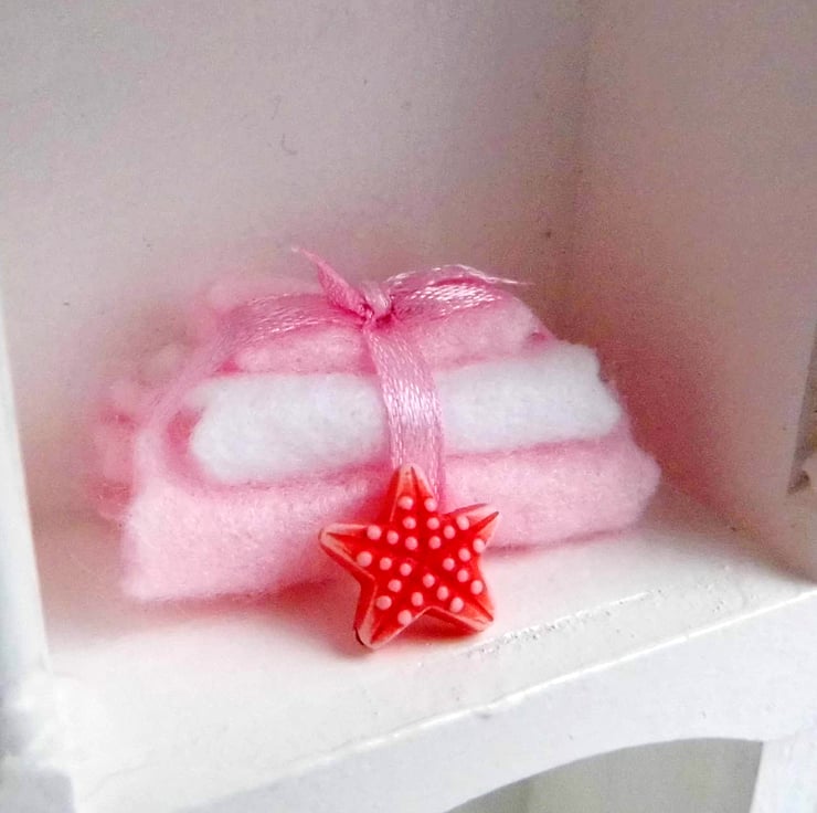 X 1 Towel bale in pink and white felt, tied together with a ribbon - Please Note : The bundle is sewn together. Measures Approx. - 3.5cm x 2 cm ( 1.25" x 0.75")