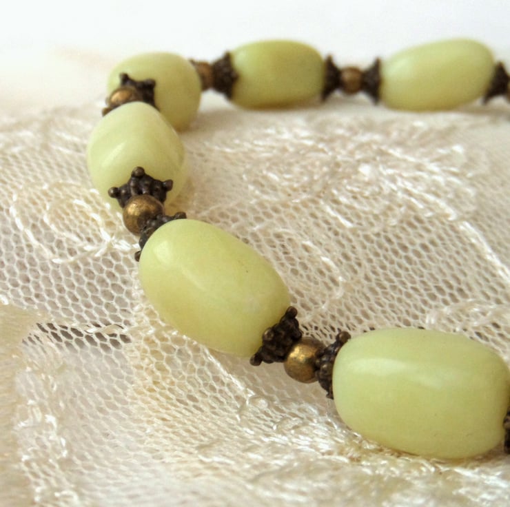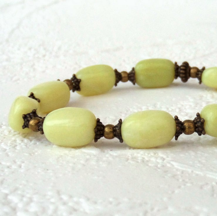 Bronze and delicate lemon yellow combine perfectly in this unique handmade bracelet.