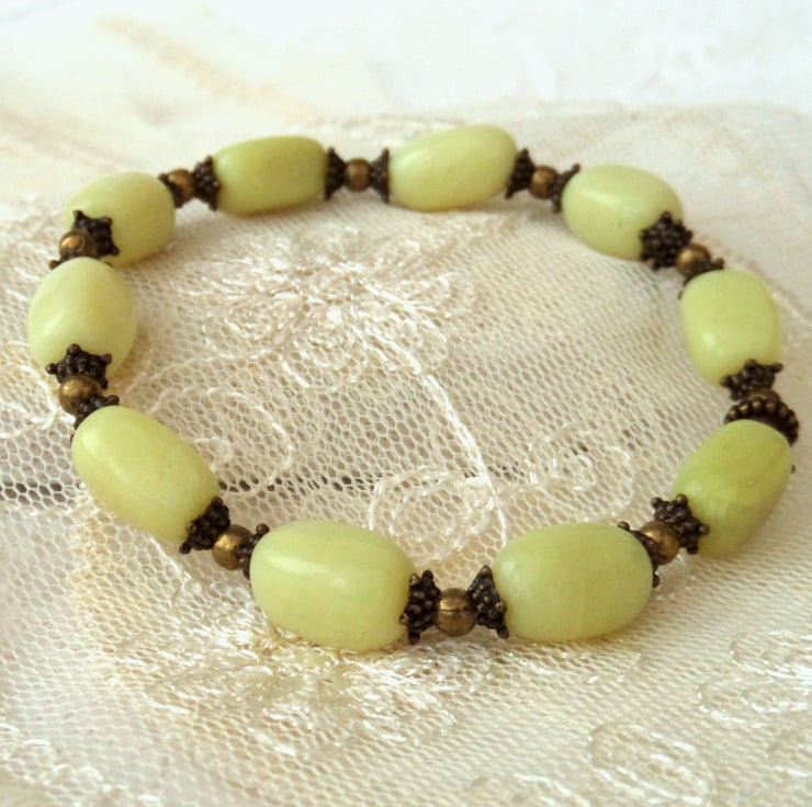The jade nuggets and bronze are threaded on stretchy jewellery elastic, giving the bracelet the ability to stretch beyond its