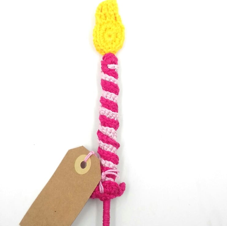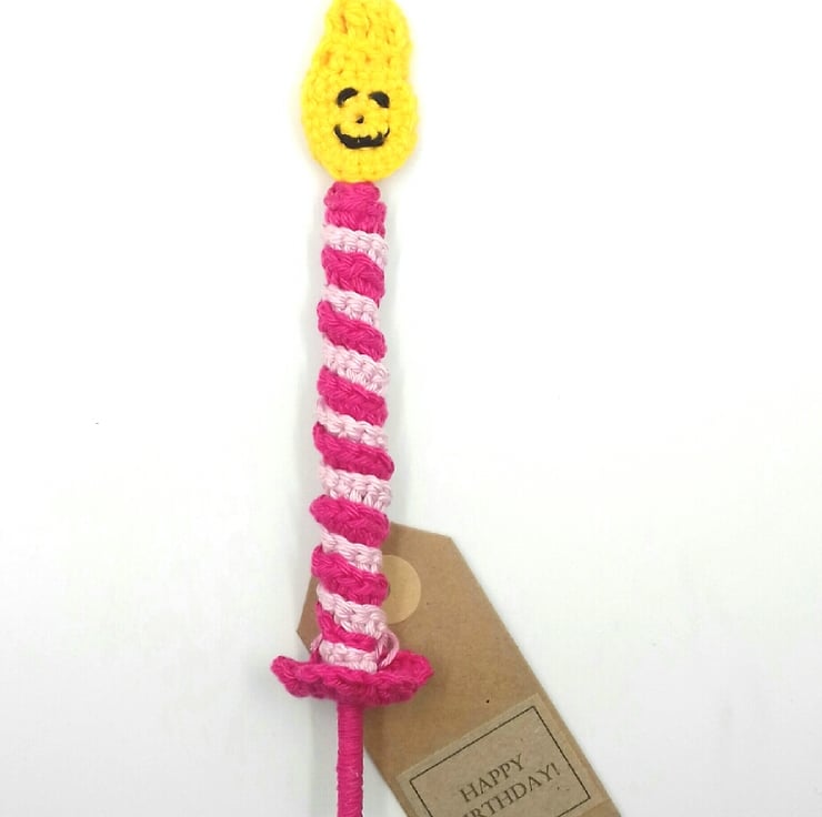 A change from a greetings card! Send a message on a stick! This larger than life birthday cake candle has been crocheted in cotton around a lolly stick. It measures approximately 18 cm in length. The tag reads 'Happy Birthday! ' on one side and is blank on the other for your own greeting.