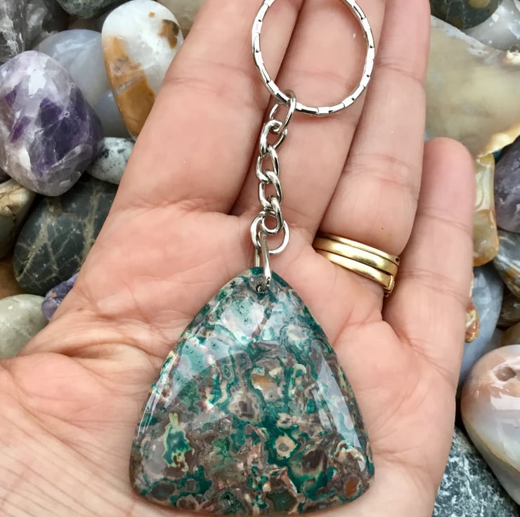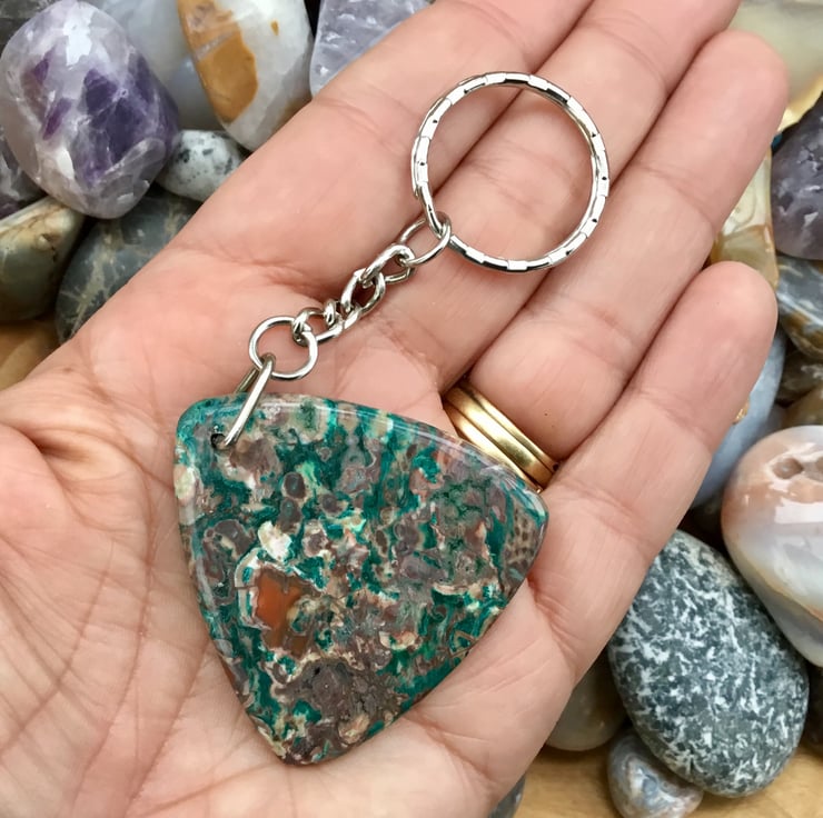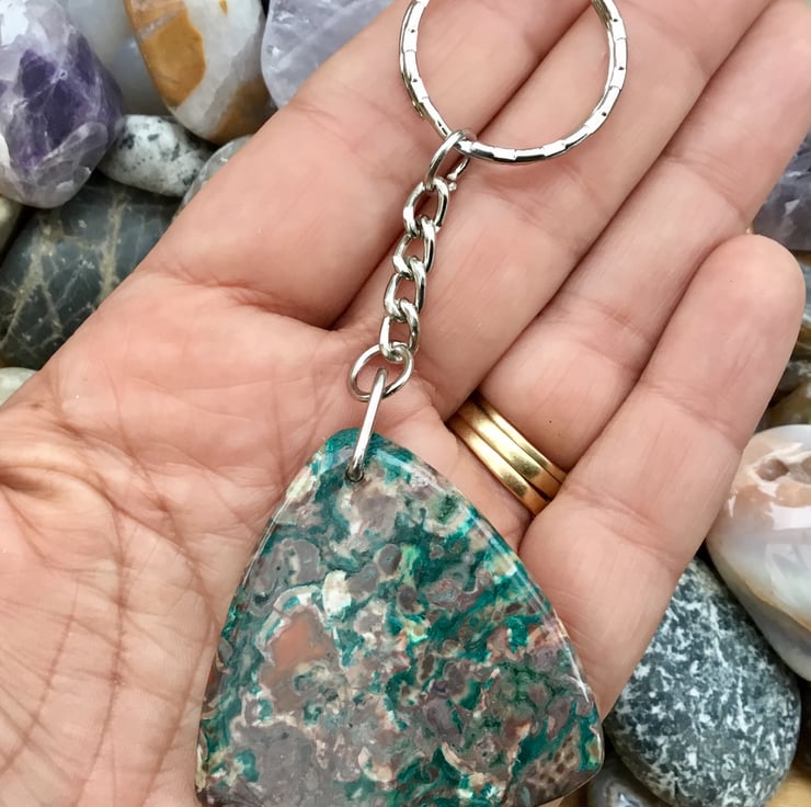 A Beautiful sea green rounded triangular Ocean Jasper Gemstone Keyring, with silver tone keychain & split ring, to make this item useable as a keyring, or handbag charm.